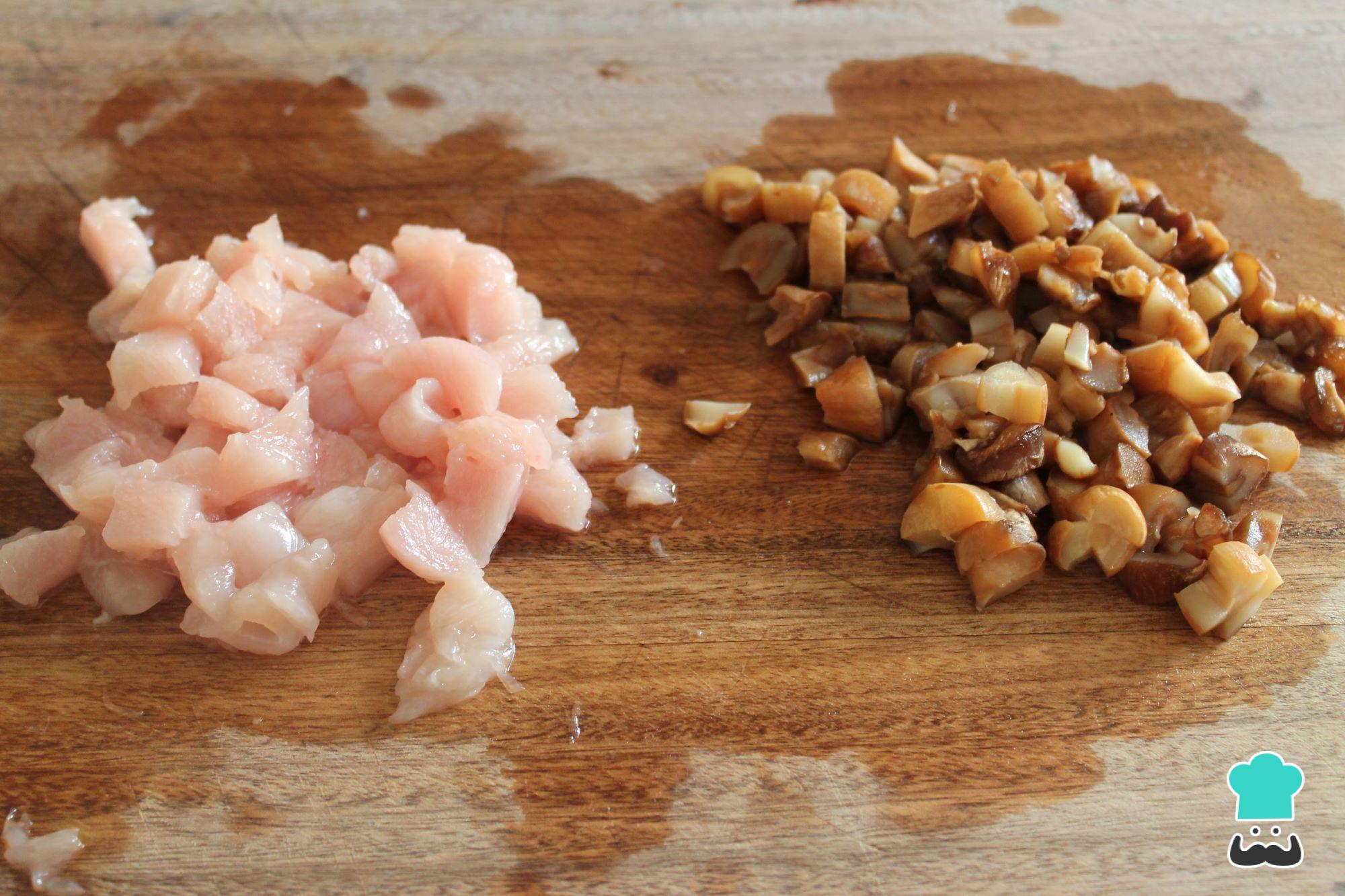 Para fazer estas deliciosas croquetes de frango sem ovos, comece pelo recheio. Para isso, corte o peito de frango em pedaços bem pequenos. Faça o mesmo com os cogumelos portobello, cortados em pedaços bem pequenos.