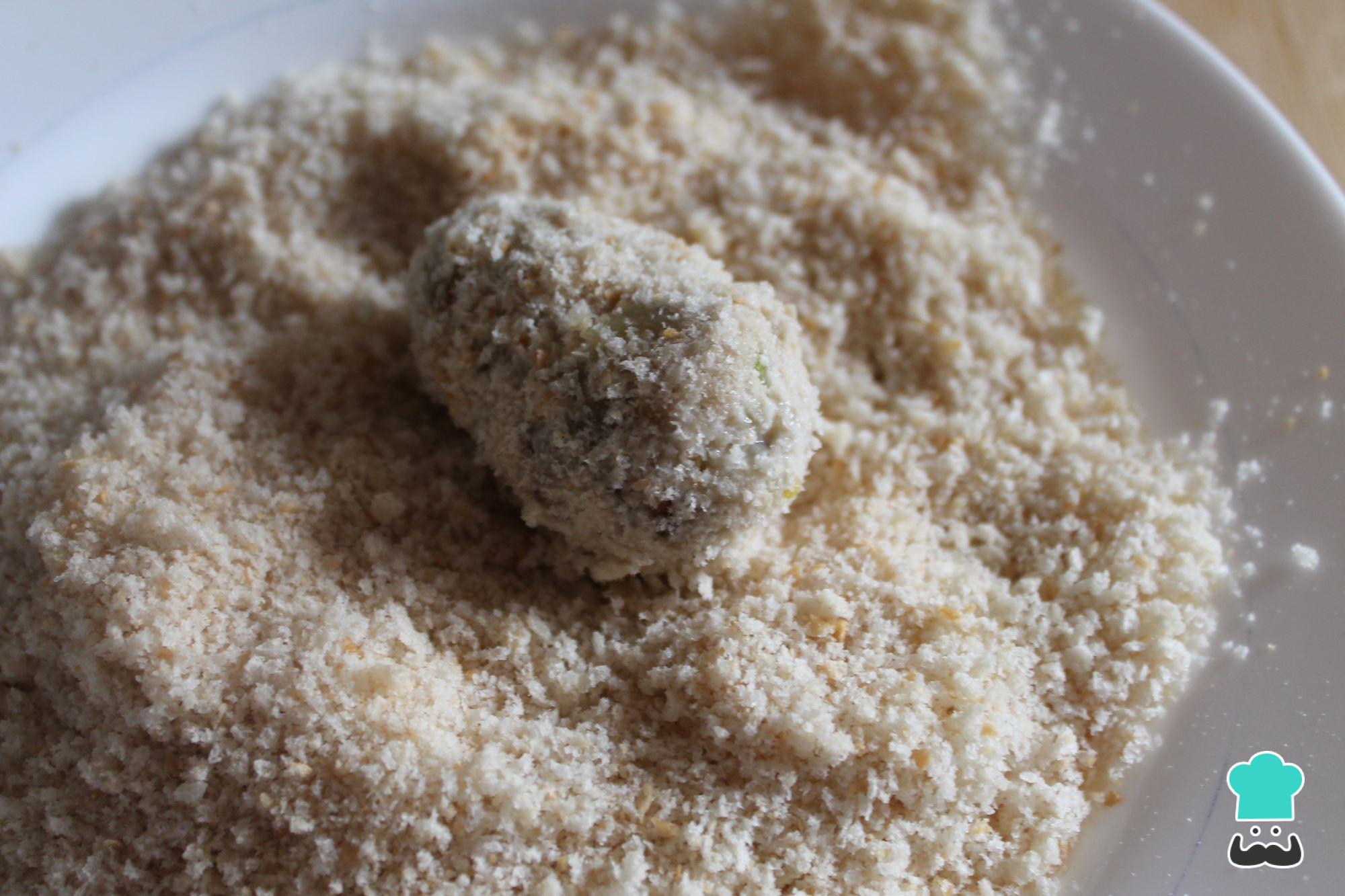 Em seguida, passe a croquete coberta com o falso ovo pela farinha de rosca. Pressione um pouco com as mãos para que a farinha fique bem aderida.