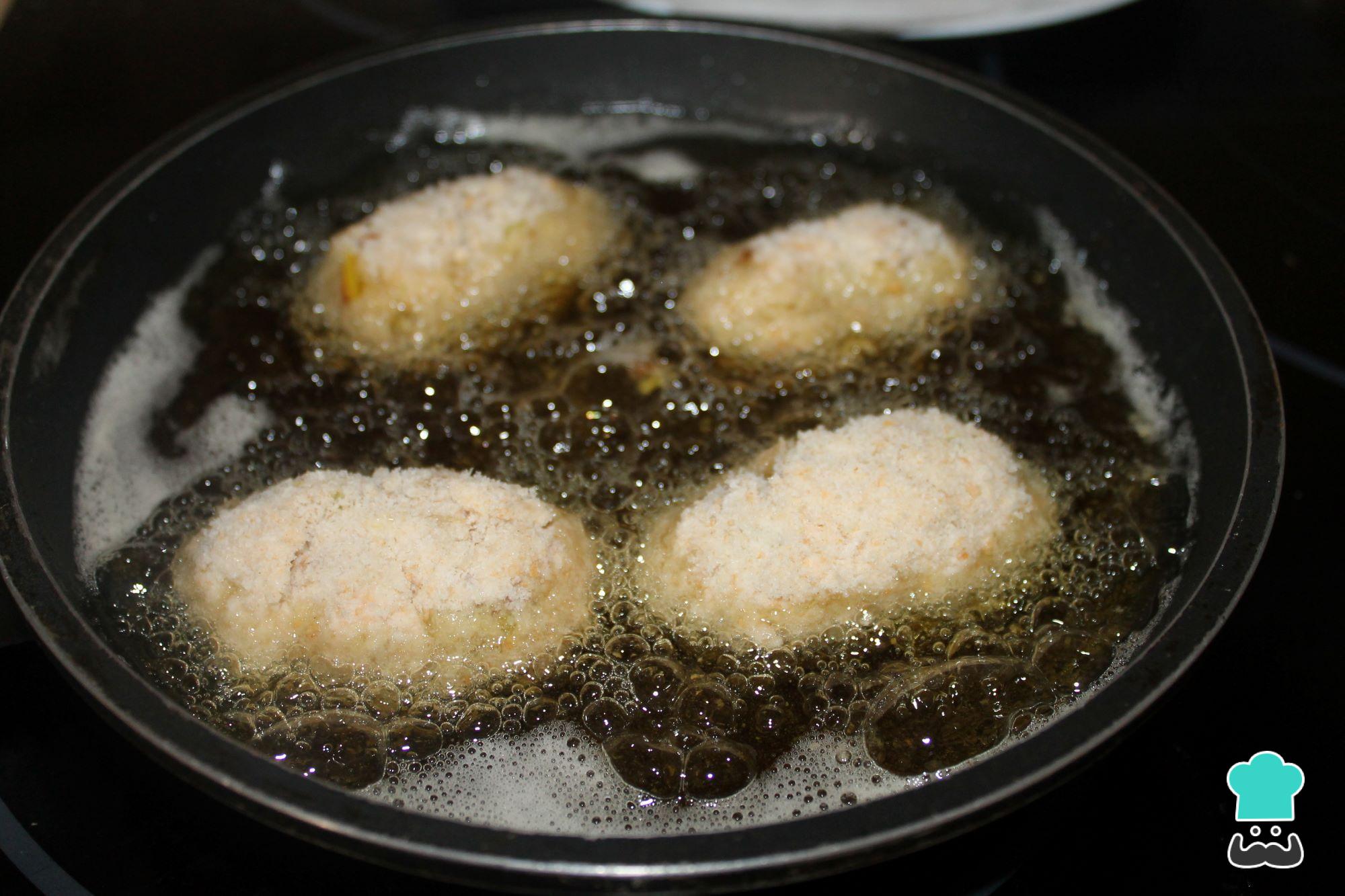 Depois de dar forma a todas as croquetes, coloque os 300 ml de azeite numa frigideira e quando estiver bem quente, frite as suas croquetes de frango.