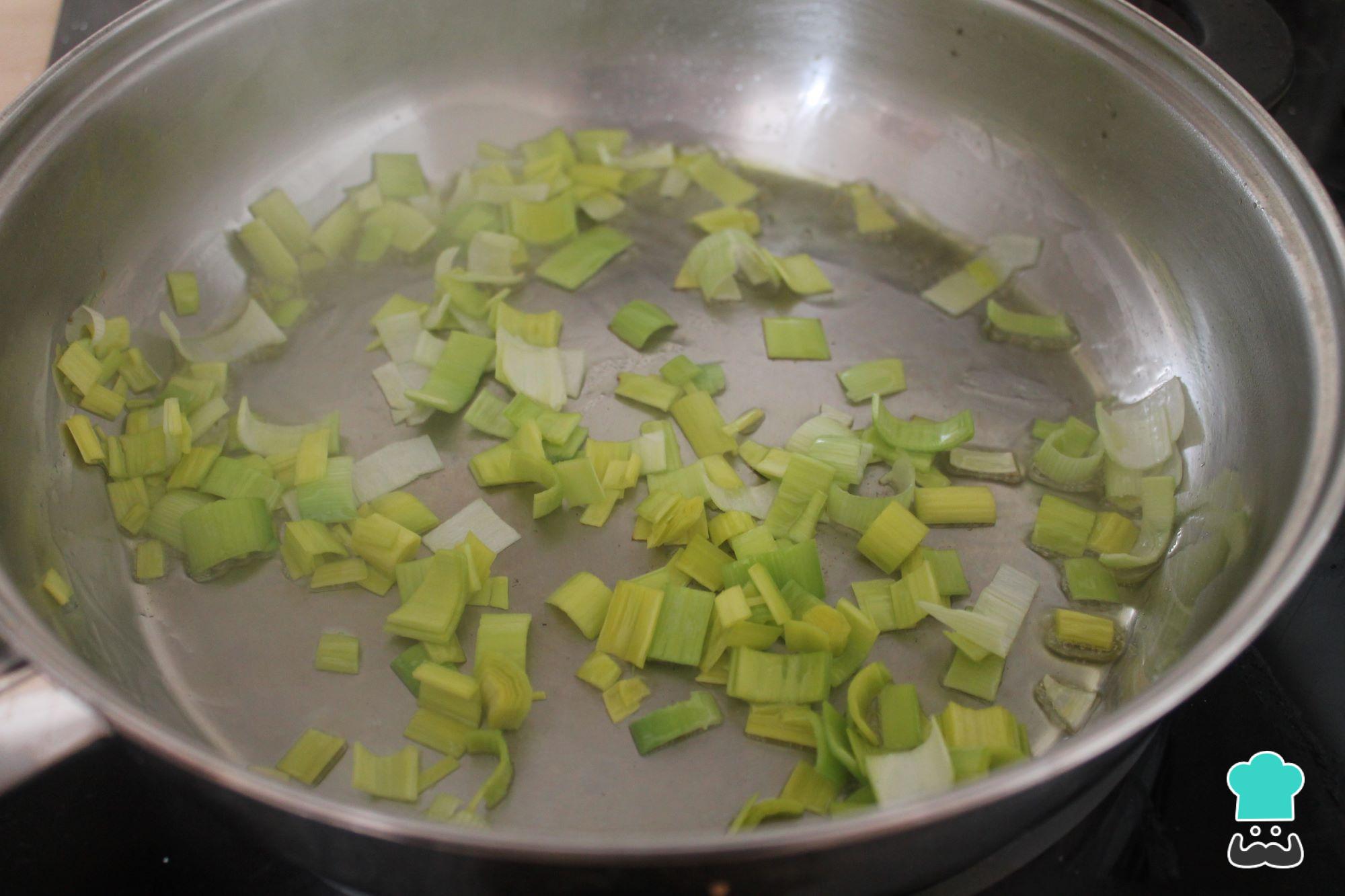 Em seguida, pique o alho-poró e aqueça três colheres de sopa de azeite em uma panela maior e frite o alho-poró em fogo baixo.