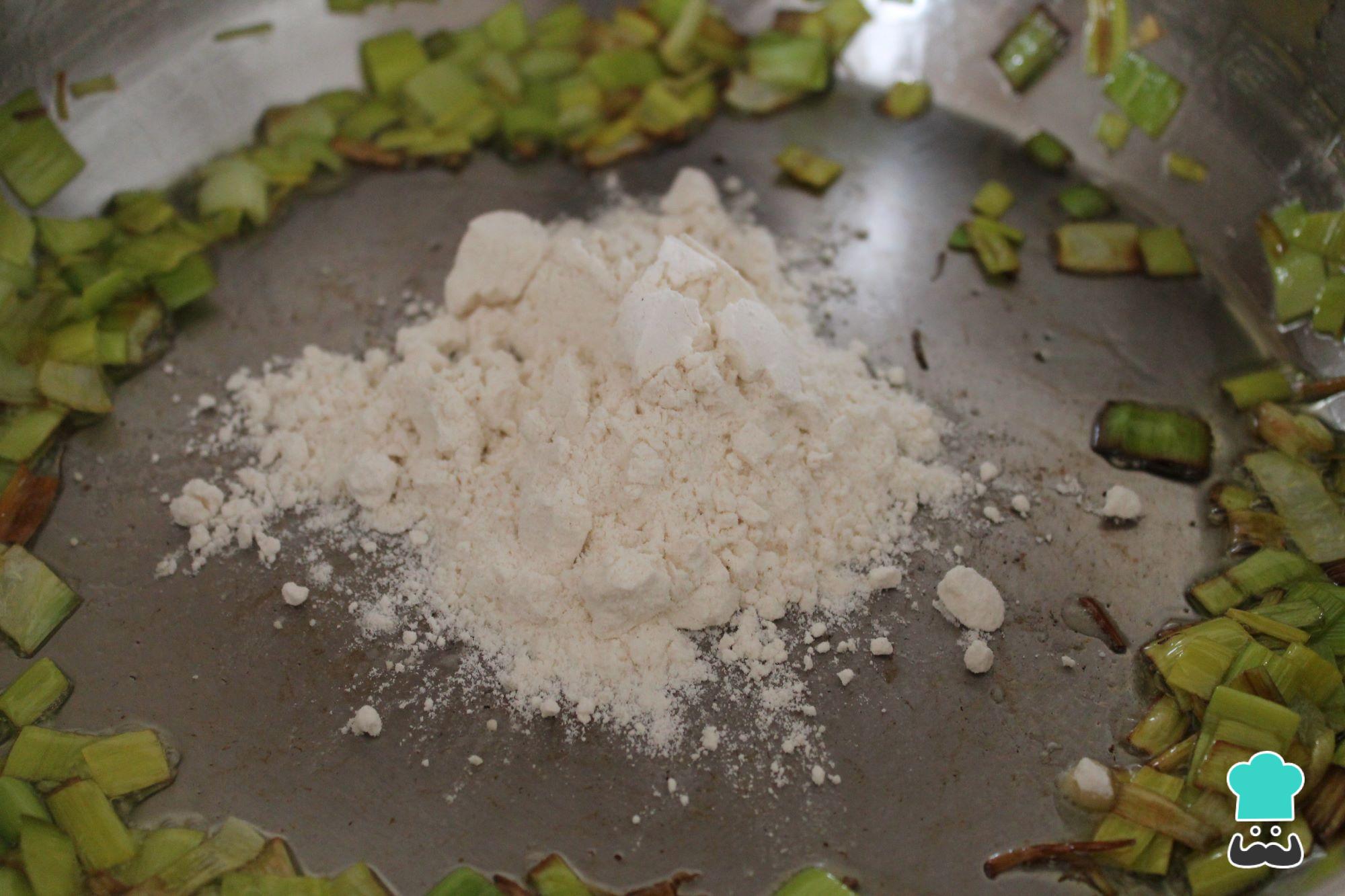 Quando o alho-poró já estiver bem refogado junte as quatro colheres de sopa de farinha de trigo e misture bem.