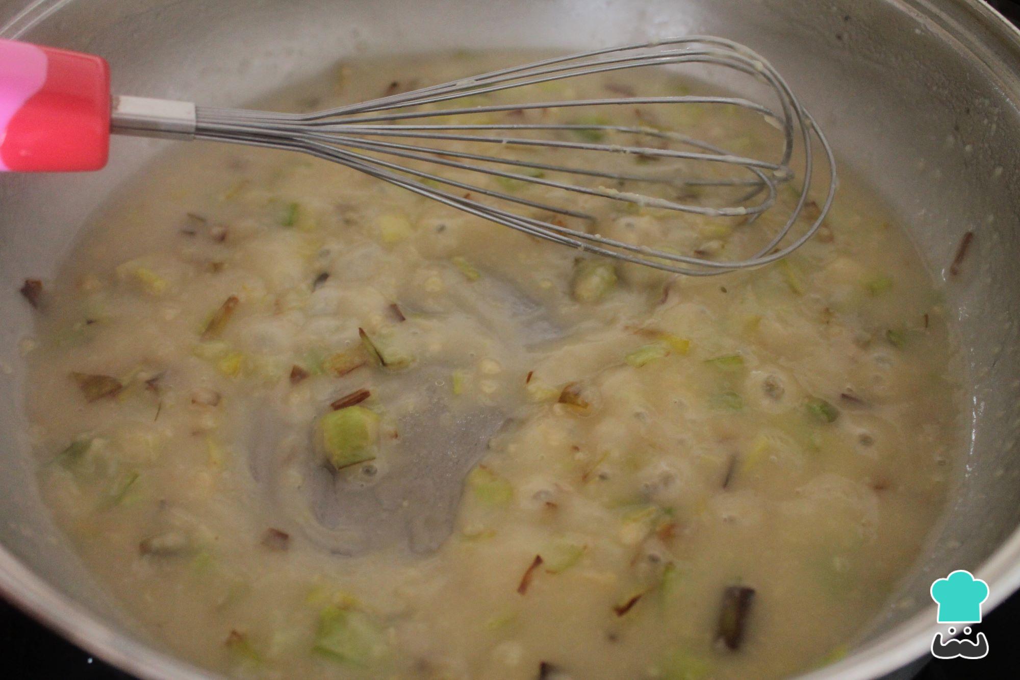 Em seguida, despeje o caldo de legumes ou de galinha mexendo bem para evitar possíveis grumos até que o caldo engrosse.