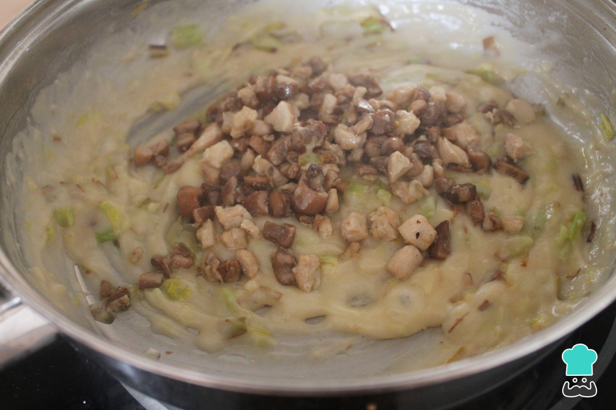 Depois de picar bem o peito e os cogumelos, aqueça uma colher de sopa de azeite numa frigideira e quando estiver bem quente, frite os cogumelos e o peito de frango picado, reserve enquanto continuamos com o recheio.