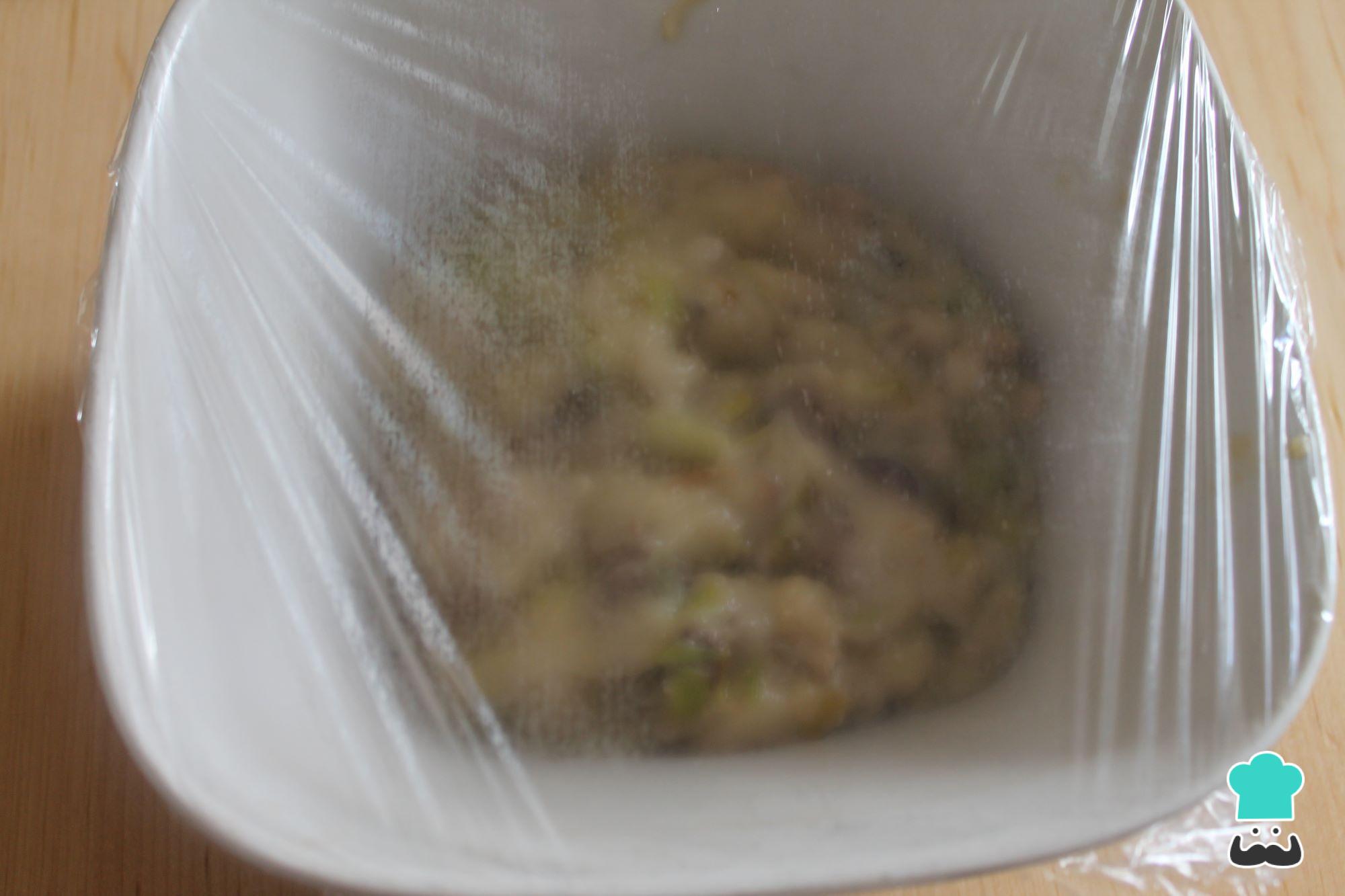 Transfira o recheio para uma tigela, cubra com filme plástico e, depois de frio, reserve na geladeira por cerca de 4 horas ou durante a noite.