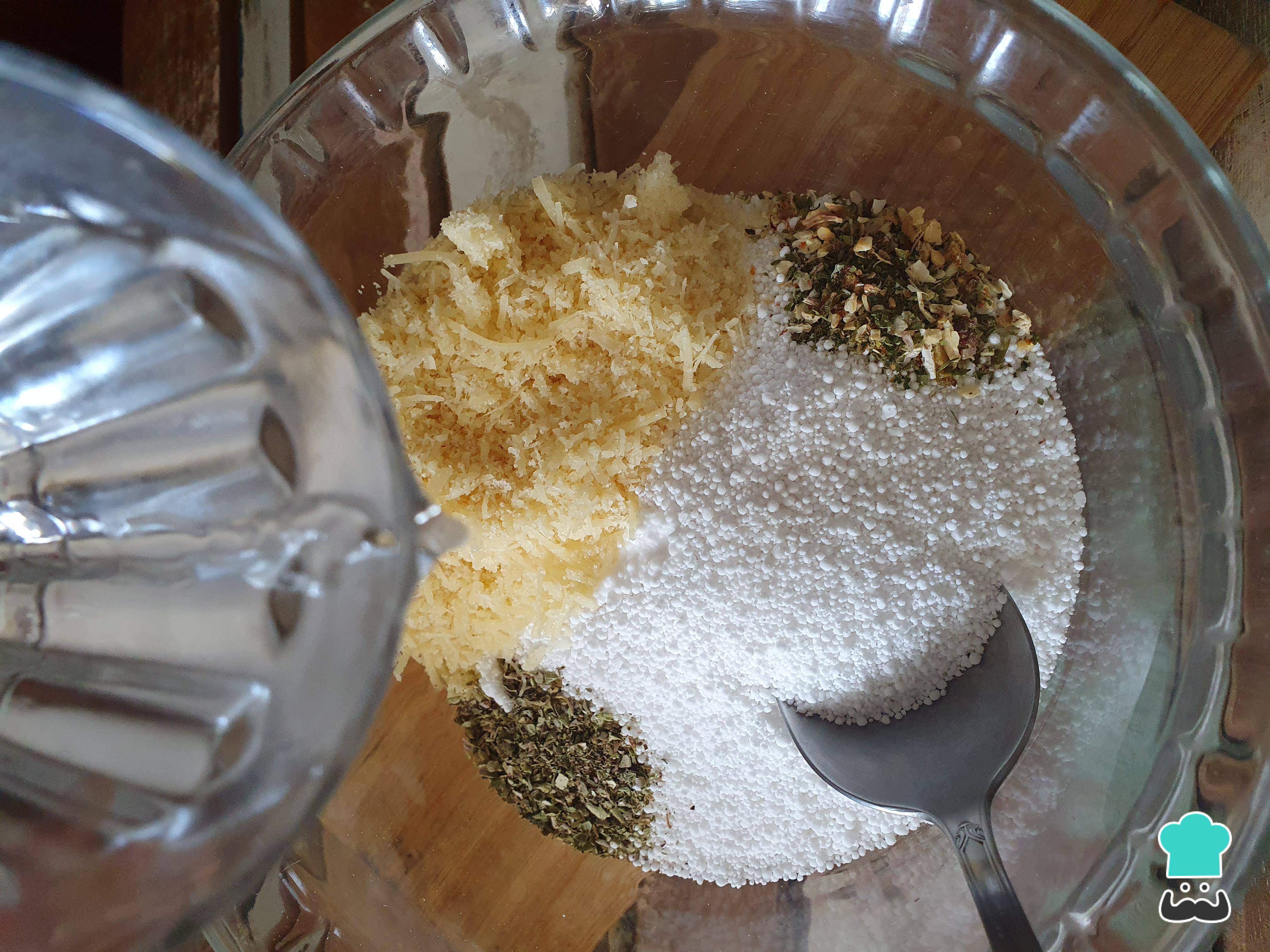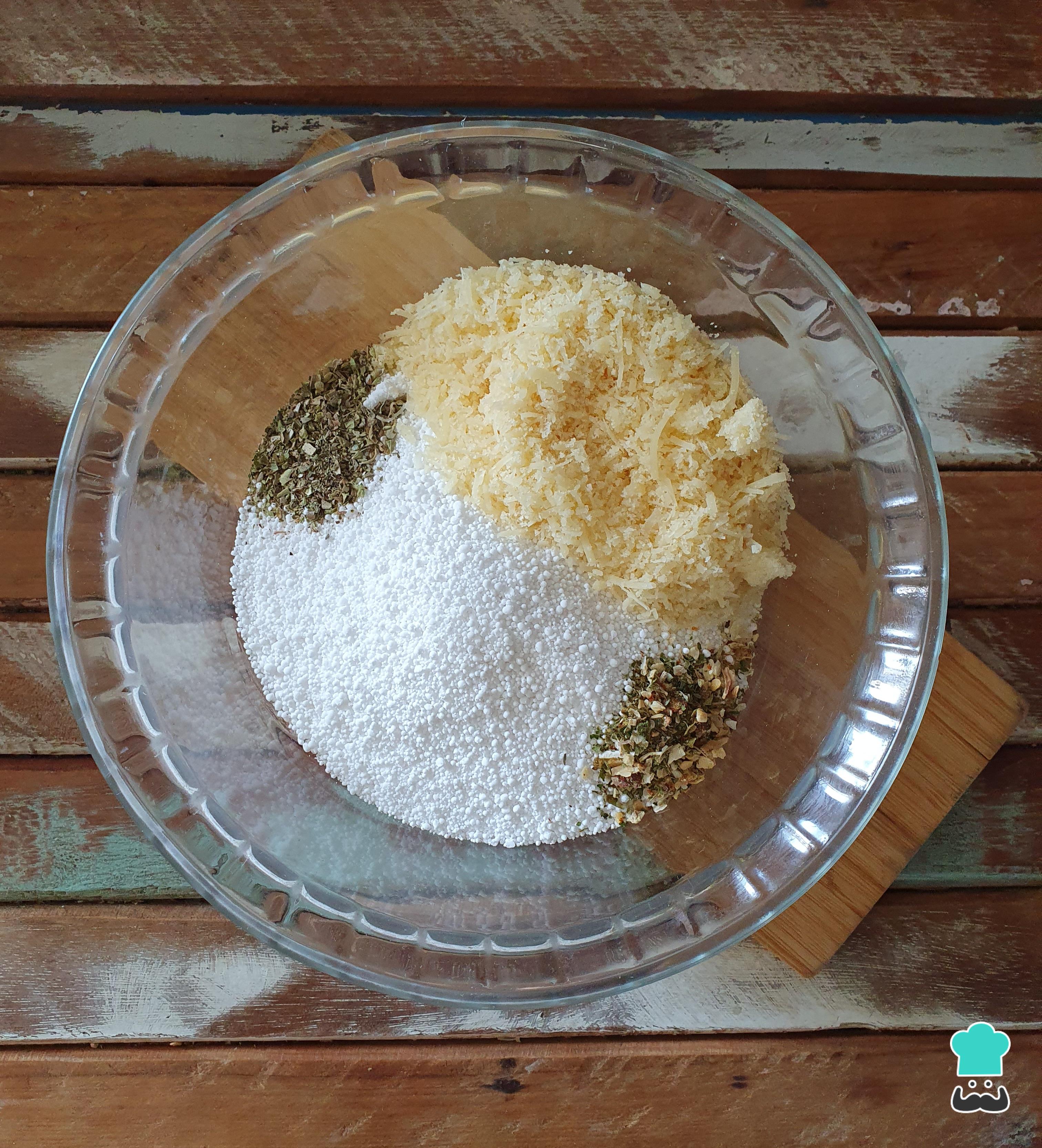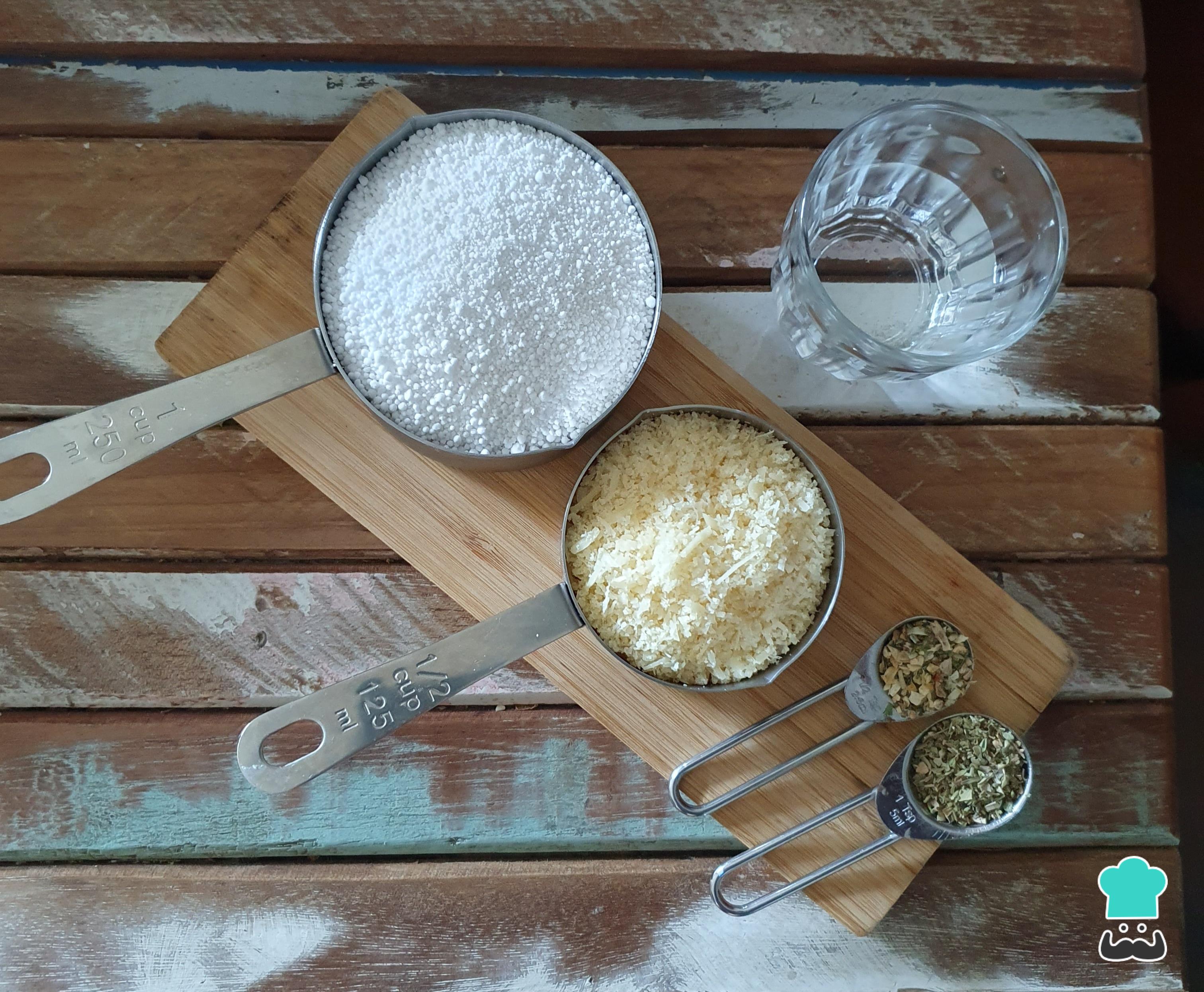Comece separando os ingredientes para preparar o seu crostini de tapioca: tapioca, queijo parmesão ralado, orégano, chimichurri e a água morna.
