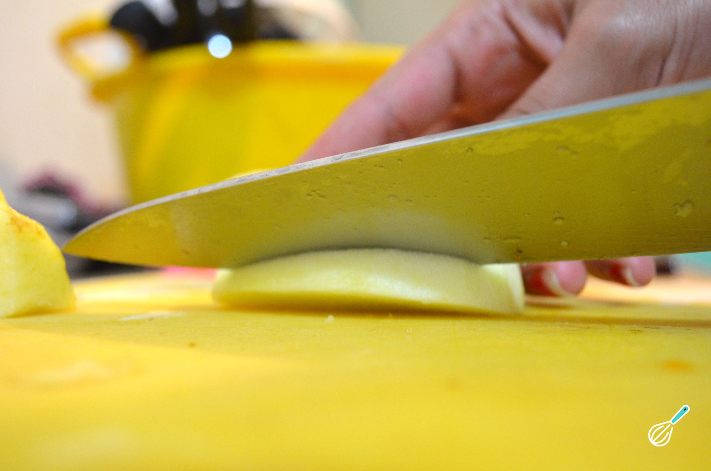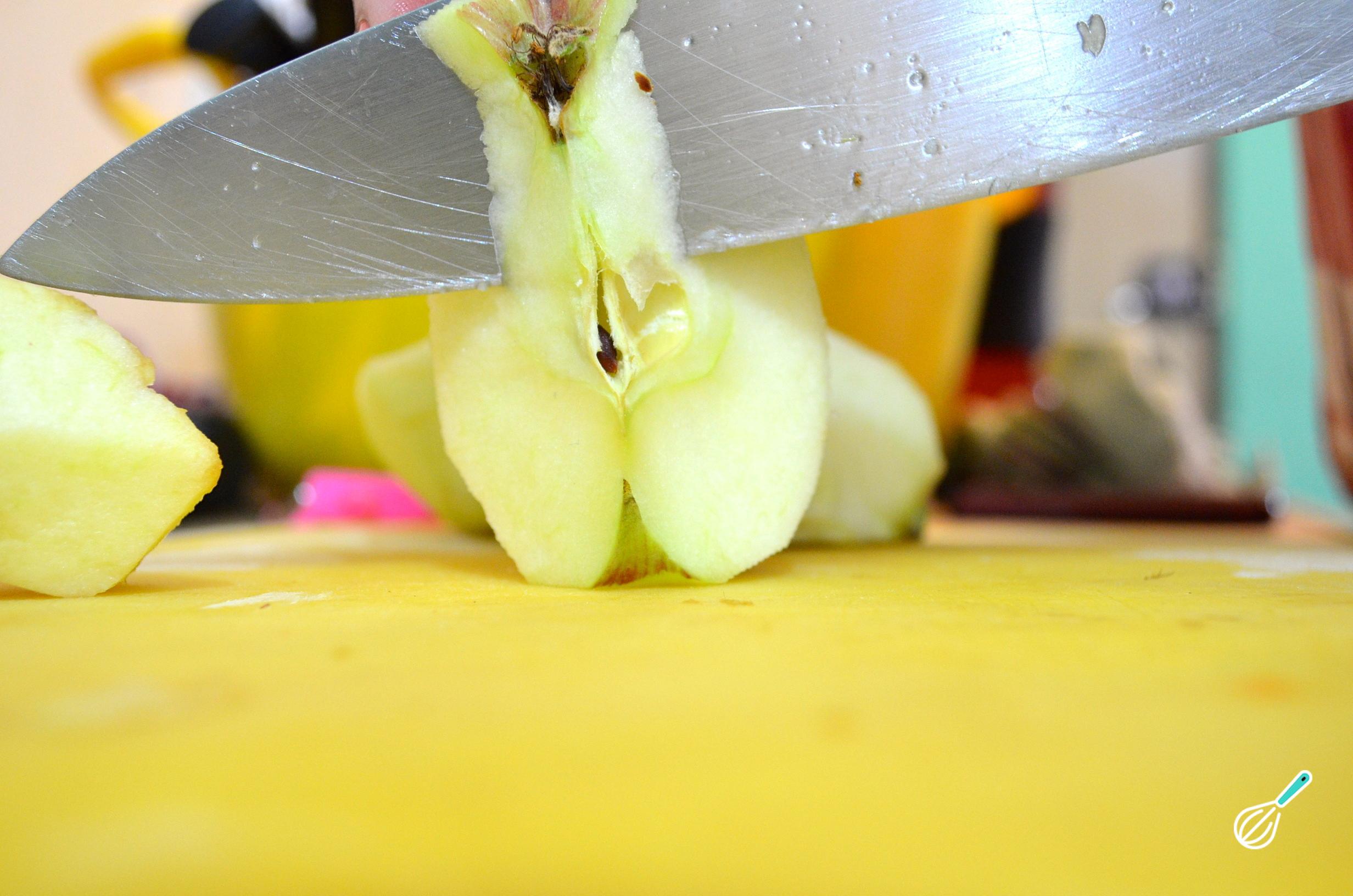 Corte cada pedaço de maçã em fatias finas de aproximadamente 5 mm de largura.
