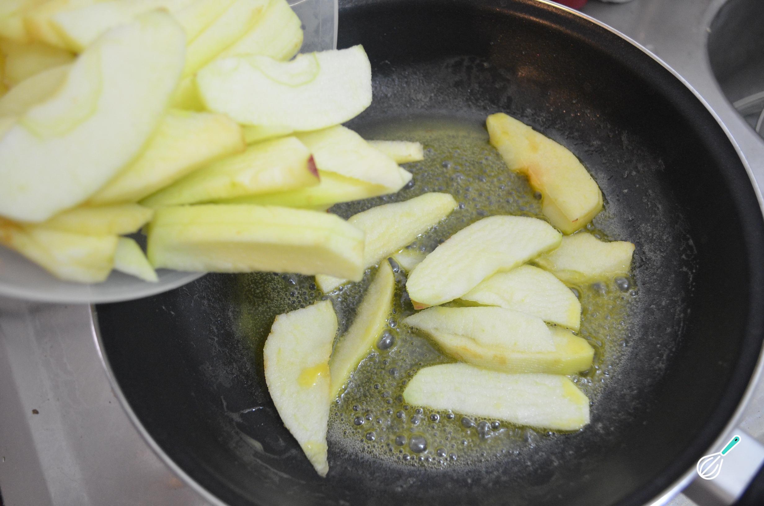 Derreta a manteiga em uma panela suficientemente grande para todas as frutas. Acrescente as fatias de maçã e frite levemente.