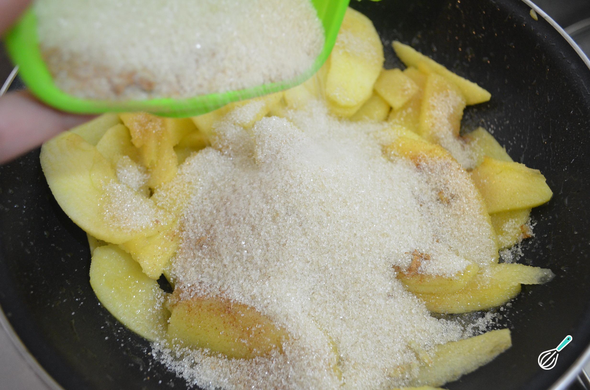 Adicione o açúcar, o gengibre e canela. Continue mexendo até que as maçãs estejam apenas cozidas.