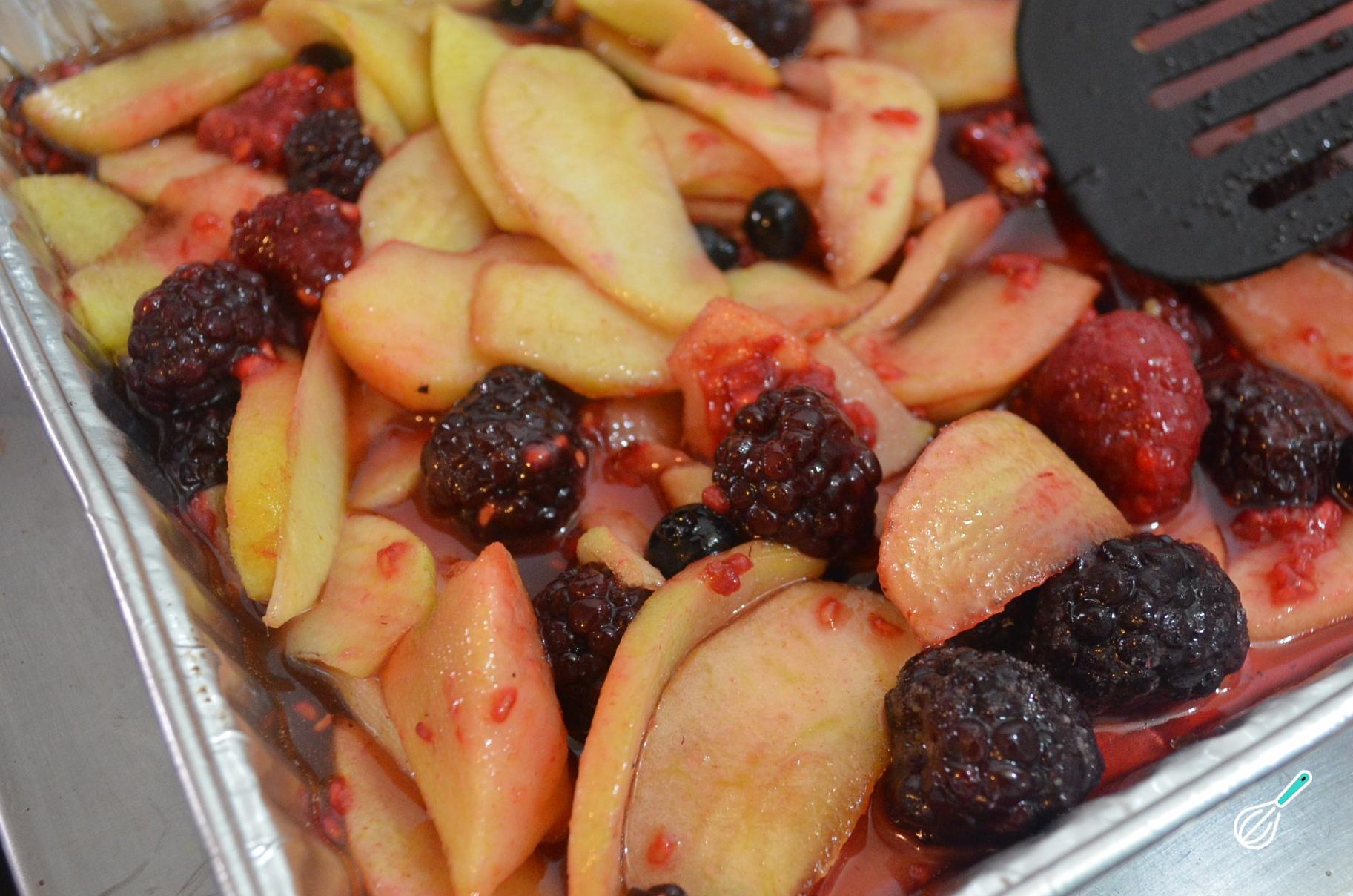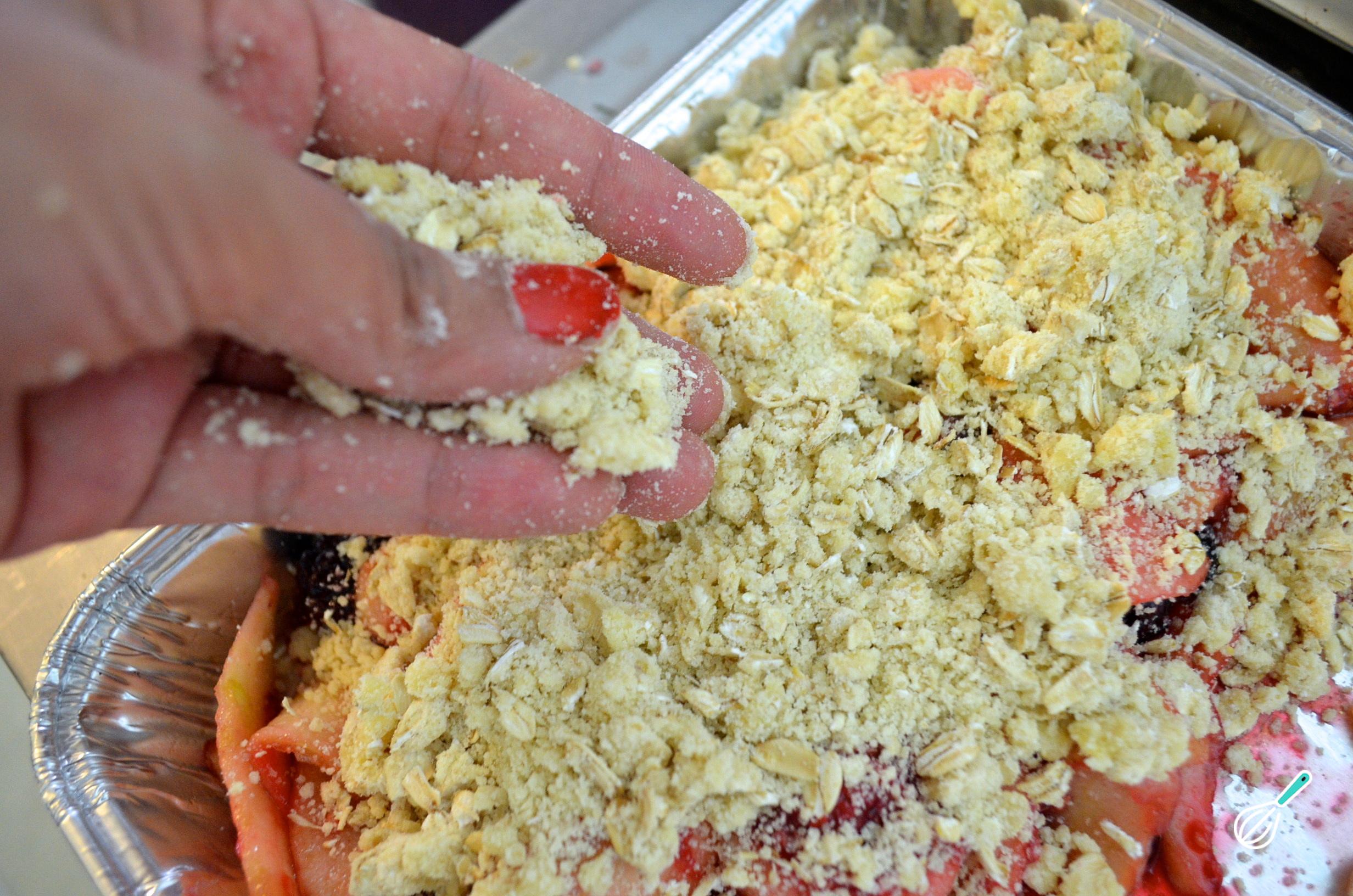 Polvilhe a mistura de crumble sobre a fruta, cobrindo-o completamente. Compacte um pouco com as mãos, prestando atenção para não bater.