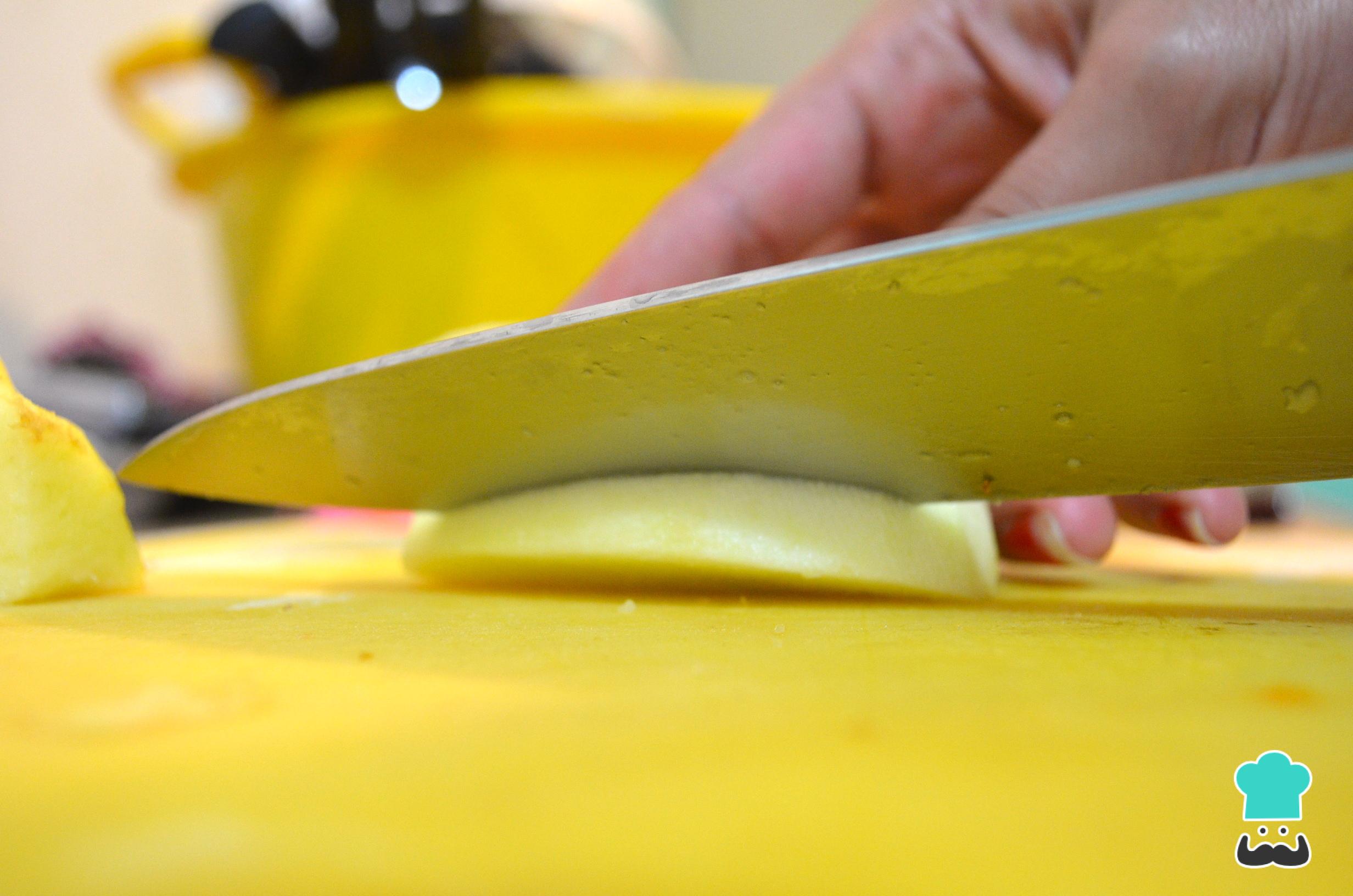 Para começar a preparar o crumble de maçã com framboesa, comece por descascar e cortar as maçãs em fatias. Em seguida, coloque todas as frutas em um recipiente apropriado para forno.