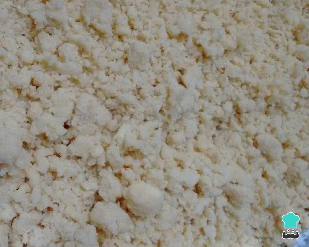 Próximo passo é preparar a massa desta receita de cuca alemã com noz. Para isso, em uma vasilha apropriada, coloque os ingredientes secos e misture, acrescente a manteiga e os ovos e misture até formar uma farofa úmida.