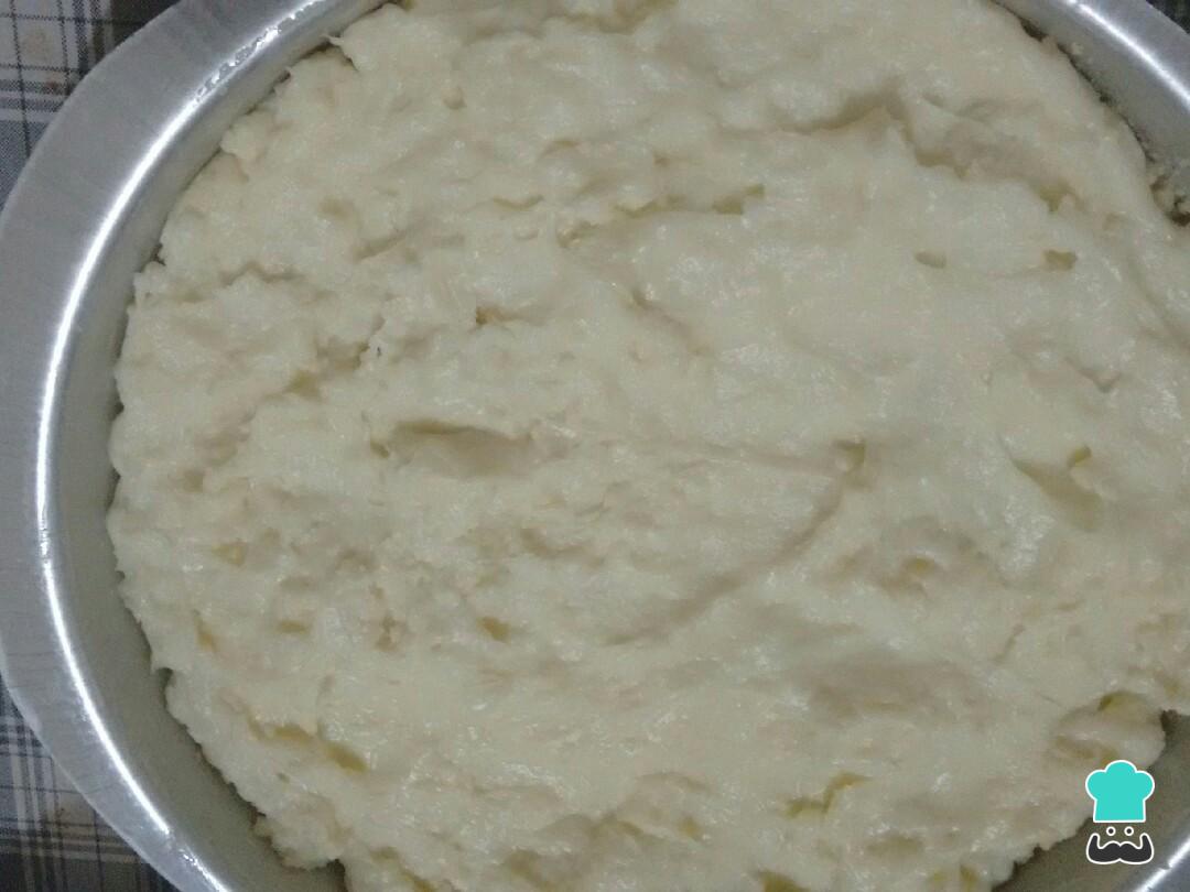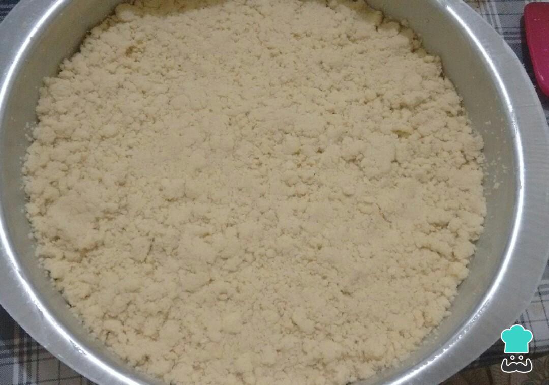 Agora é hora de montar a cuca! Para isso unte uma forma e espalhe no fundo metade da massa.