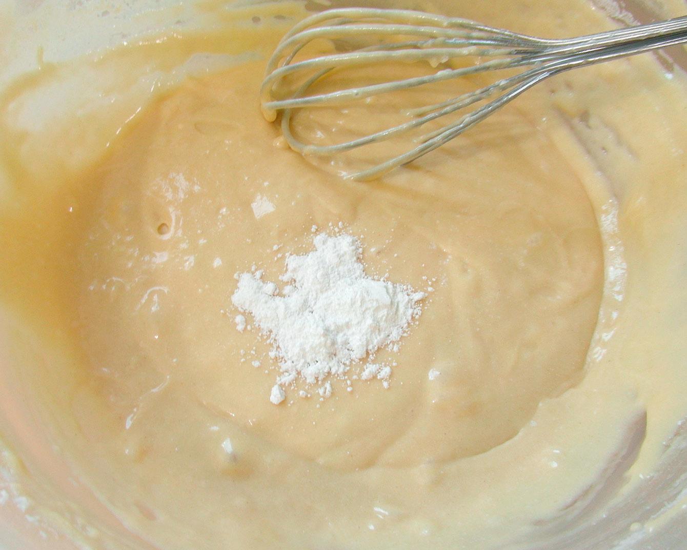 Num recipiente coloque o trigo e a maisena juntas e peneiradas. Adicione ao creme anterior, misturando bem e alternando com o leite. Por último adicione o fermento e o sal e misture levemente.
