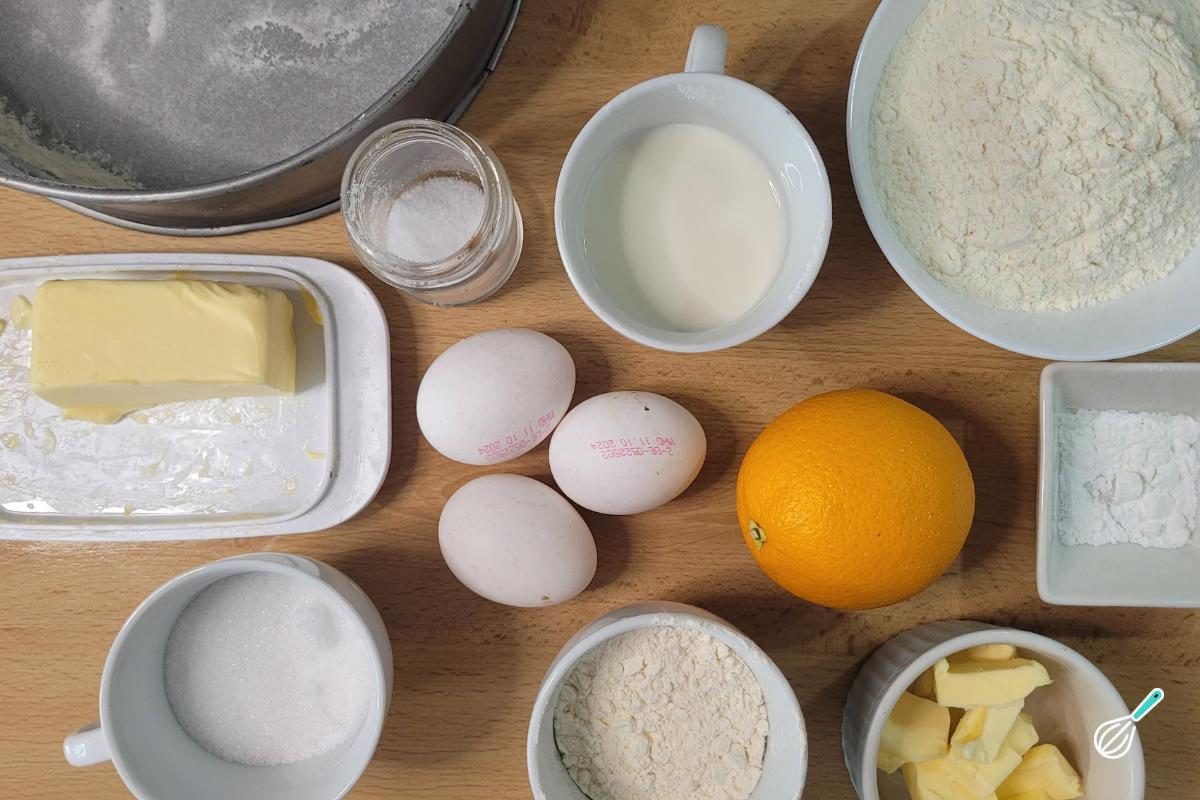 Separe os ingredientes para fazer sua cuca de laranja. Para a massa, é importante que a manteiga esteja em temperatura ambiente em ponto pomada, para bater com o açúcar.