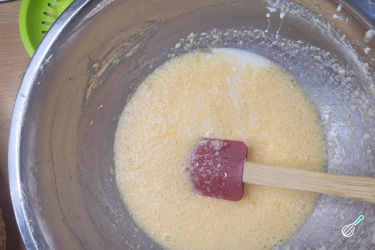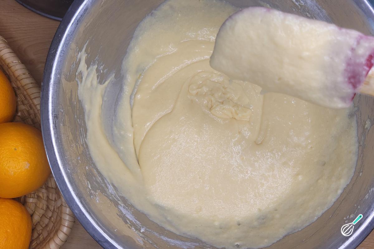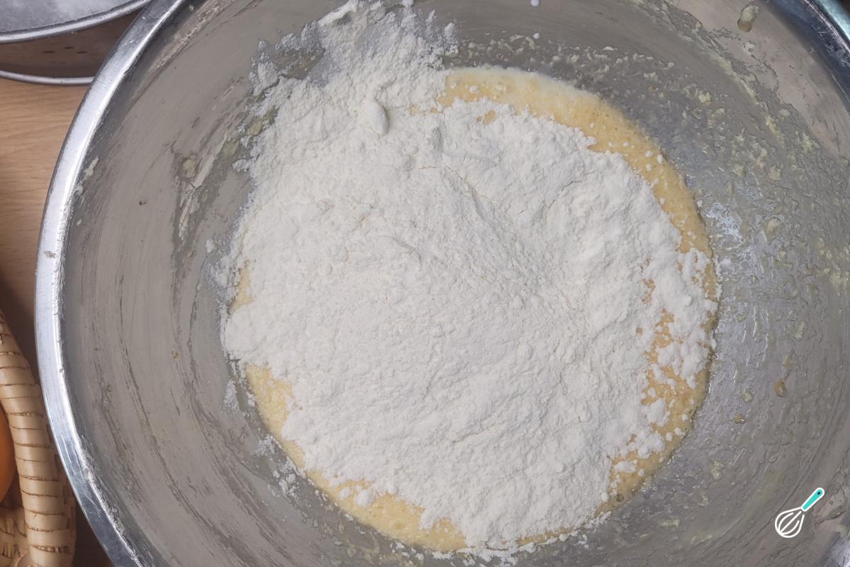 Misture bem até ter uma massa bem lisa. Pode usar um batedor de arame ou uma espátula. O importante é que a massa fique bem homogênea sem bater demais para não desenvolver o glúten e o bolo ficar fofinho. Depois de incorporar toda a farinha, adicione o fermento em pó e misture.