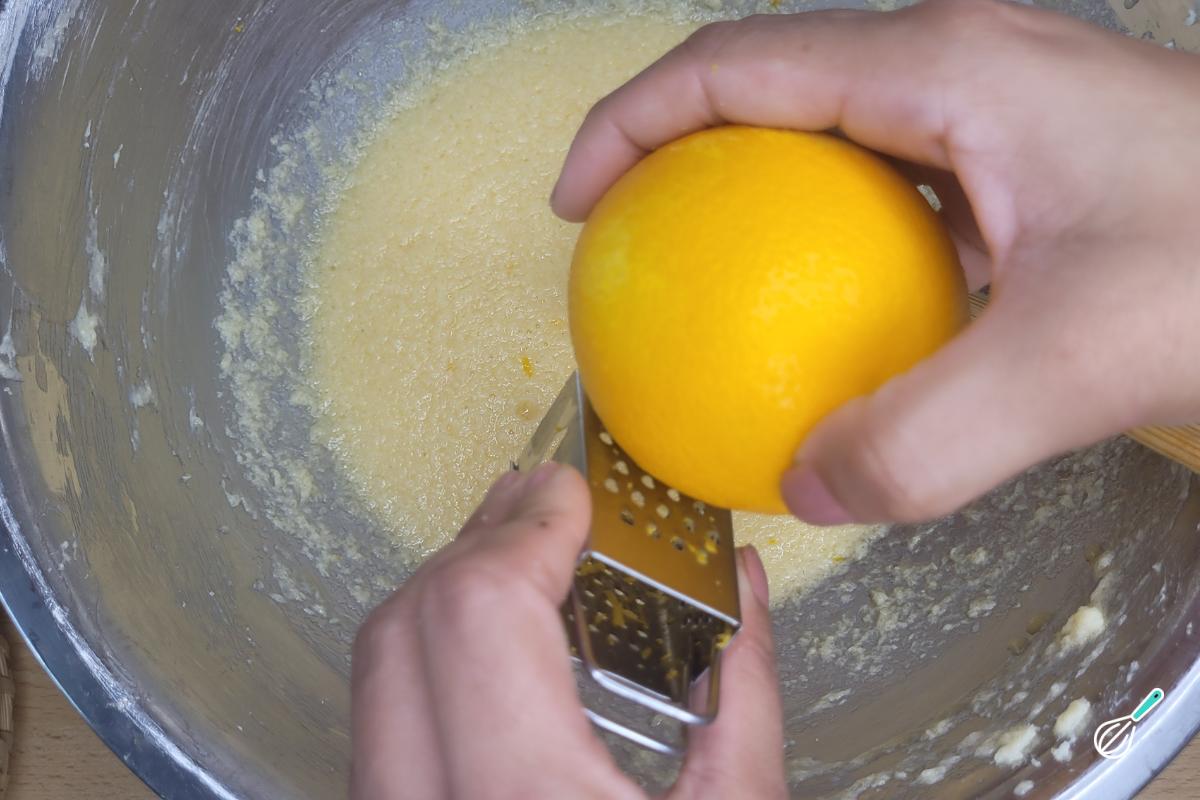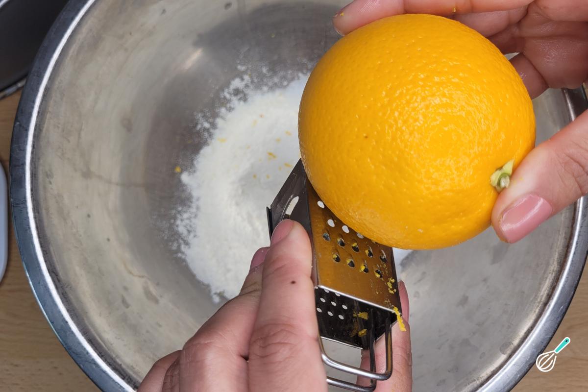 Vamos começar preparando a farofinha que vai por cima. Em uma tigela, coloque a farinha, o açúcar e as raspas de laranja.