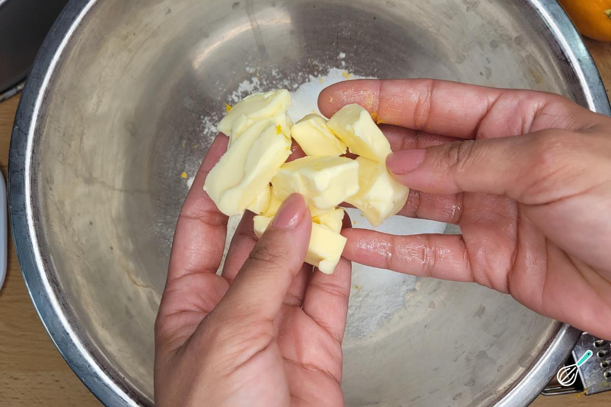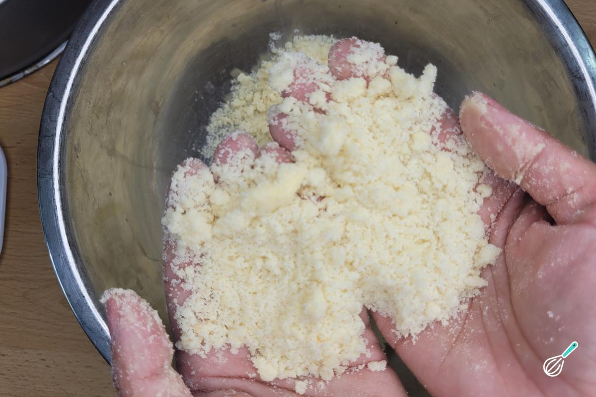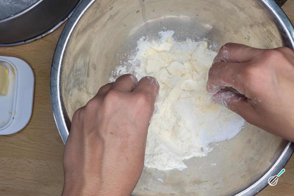 Com as pontas dos dedos, vá quebrando a manteiga e misturando com a farinha. Não se preocupe se ainda ficarem uns pedacinhos de manteiga. Isso garante que vai ficar crocante.