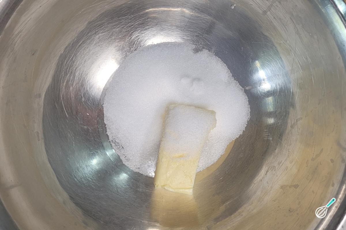 Agora vamos preparar a massa. Comece colocando a manteiga em ponto pomada e o açúcar em uma tigela ou na tigela da batedeira, caso tenha uma batedeira planetária.