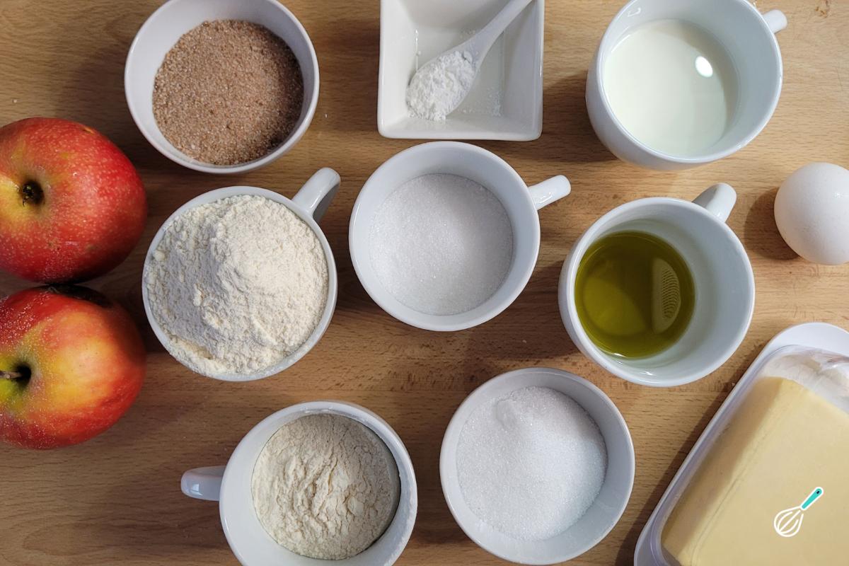 Separe os ingredientes para fazer sua cuca de maçã. Para a farofa, é essencial que a manteiga esteja gelada, pois é isso que vai garantir a crocância.