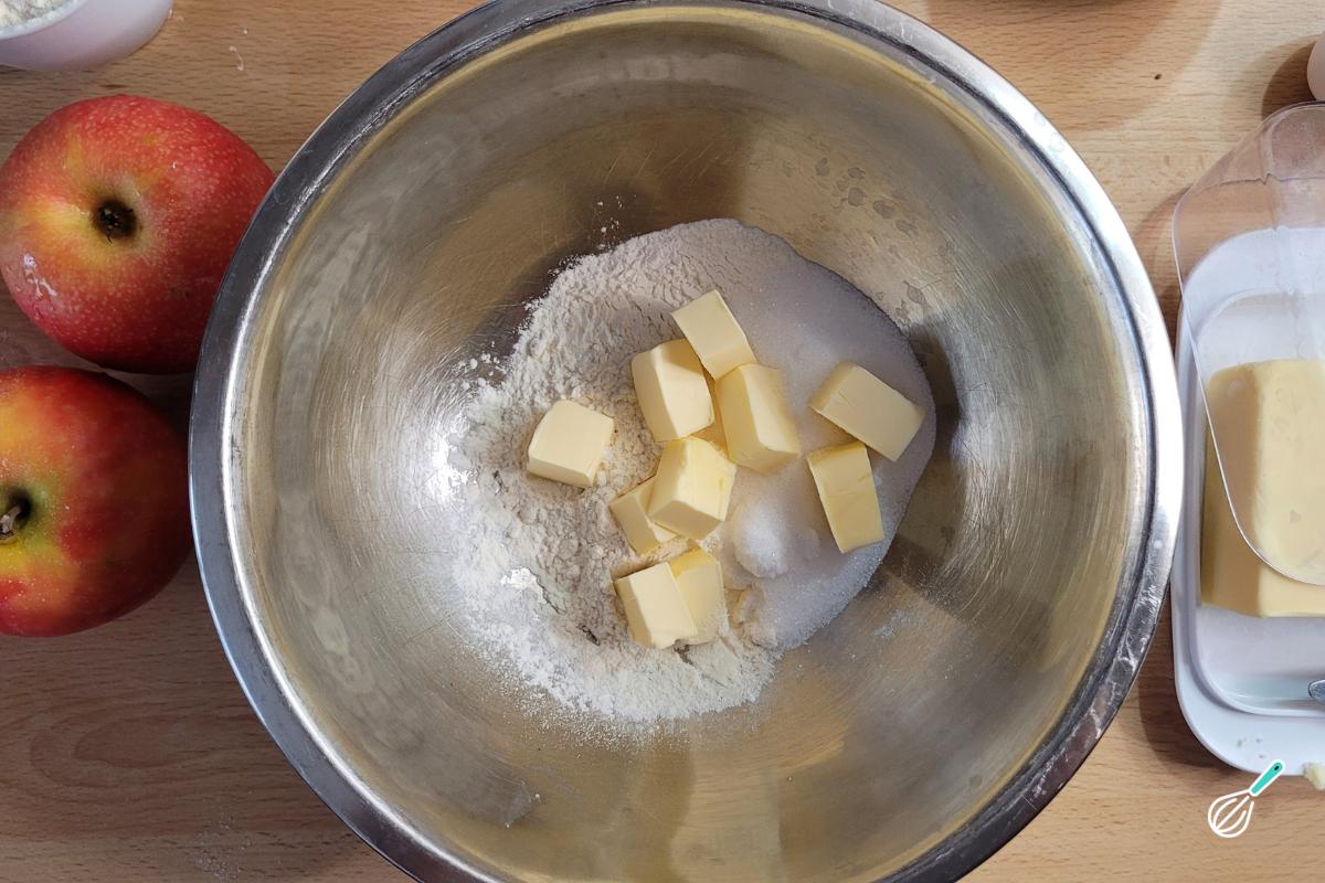 Vamos começar fazendo o crumble ou farofa crocante que vai por cima da massa. Em uma tigela, coloque a farinha, o açúcar e a manteiga gelada em cubos.