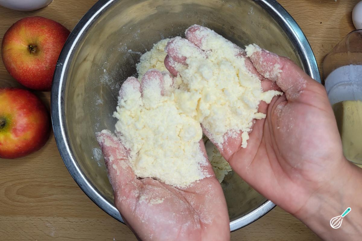 Com as pontas dos dedos, comece a misturar a manteiga com a farinha. A ideia é ir criando uma textura de farofa ou areia, sem desmanchar demais a manteiga. É isso que cria a textura crocante. Quando chegar nesta textura de farofa ou areia molhada, reserve.