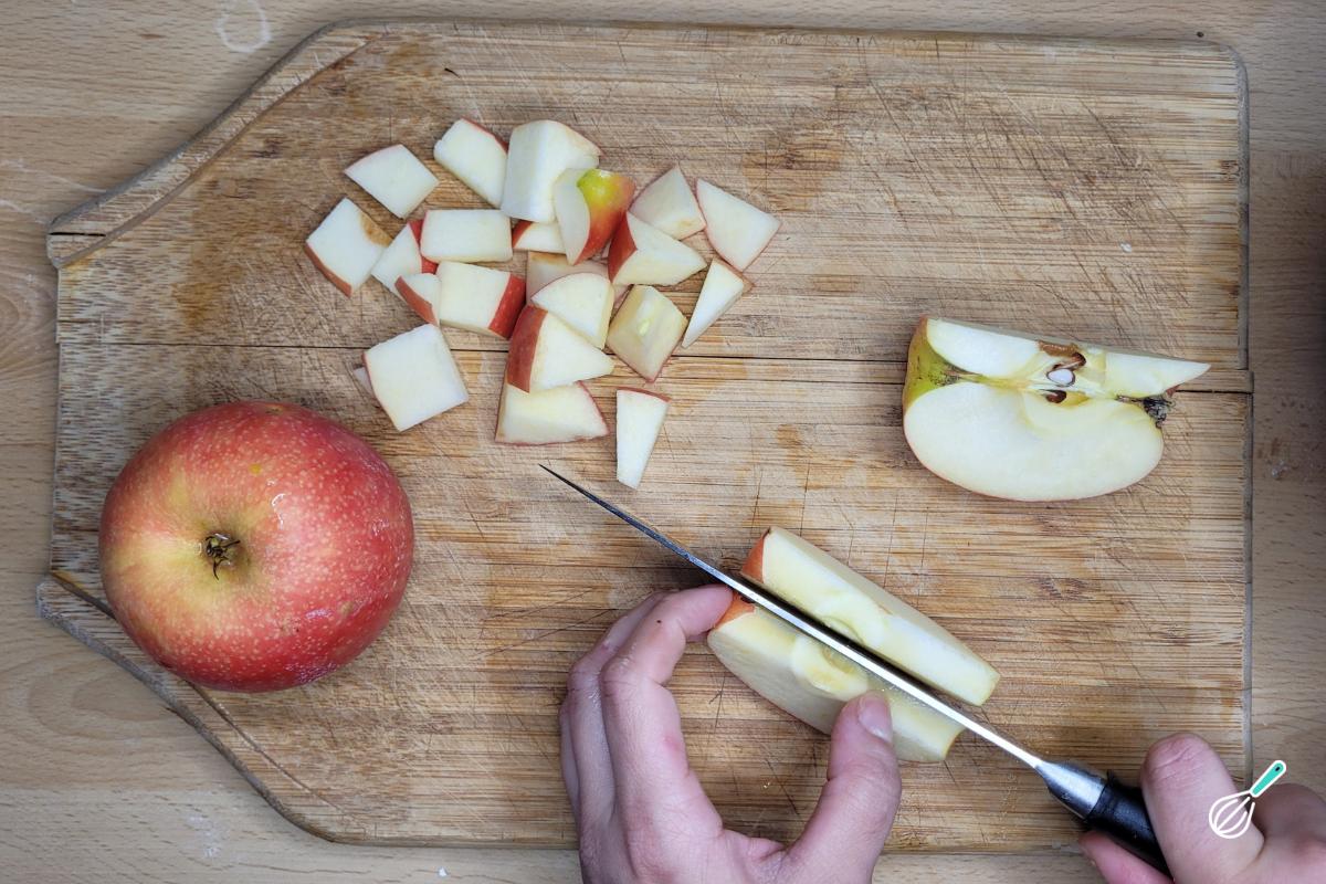 Antes de começar a massa, corte as maçãs em cubinhos. Aqui usei duas maçãs, mas dependendo do tamanho das suas maçãs e da forma, pode ser que uma seja suficiente. Eu corto com a casca mesmo para aproveitar o alimento integralmente, mas se preferir, pode descascar. A massa é rápida de preparar, mas caso esteja picando com antecedência, coloque as maçãs em uma tigela com água e algumas gotas de limão para que não escureçam. Essa dica serve inclusive caso você corte mais maçãs do que serão usadas na cuca.