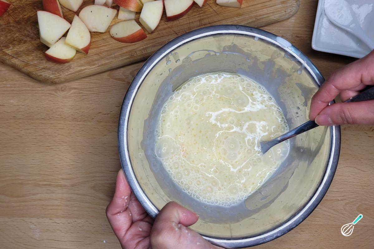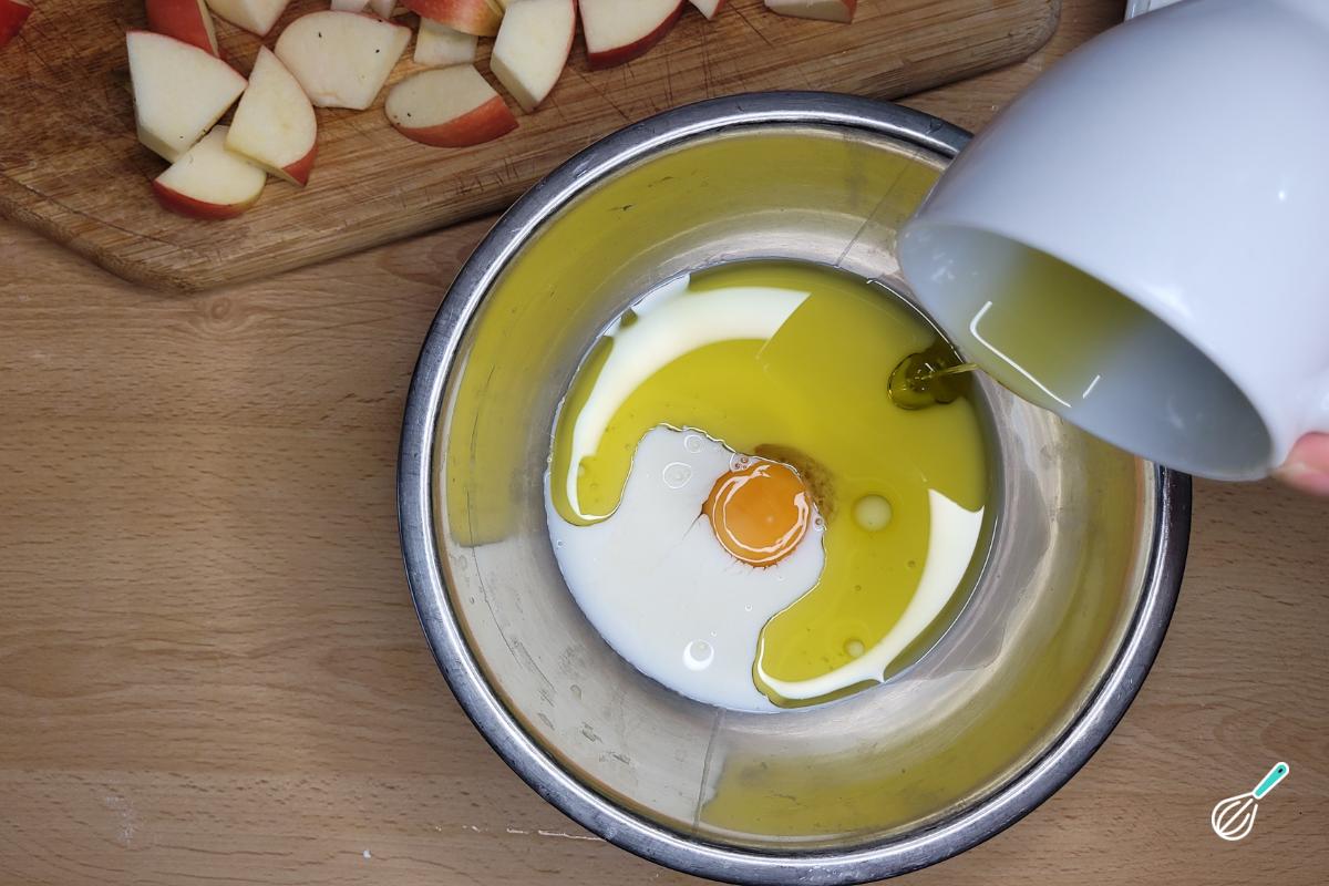 Agora vamos preparar a massa. Coloque os ingredientes líquidos em uma tigela. Eu gosto de misturar os ingredientes líquidos e secos em tigelas separadas porque facilita na hora de misturar.