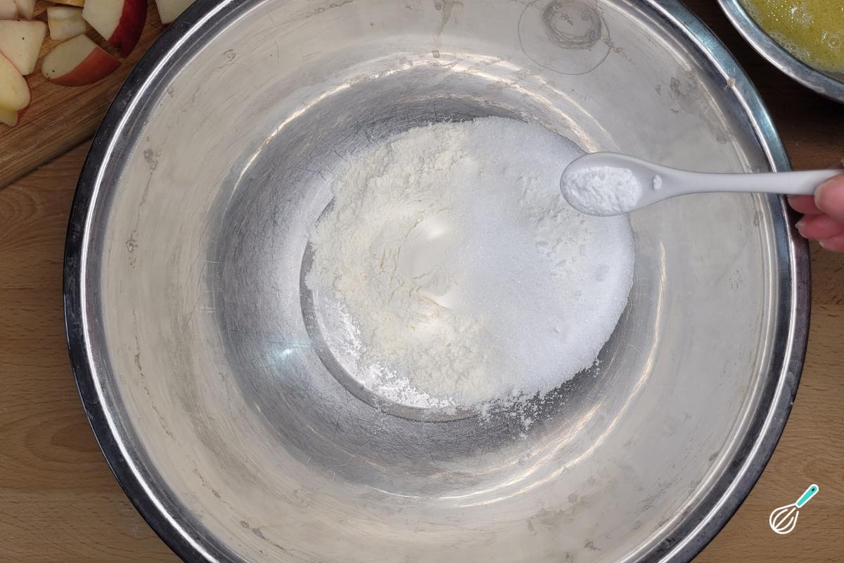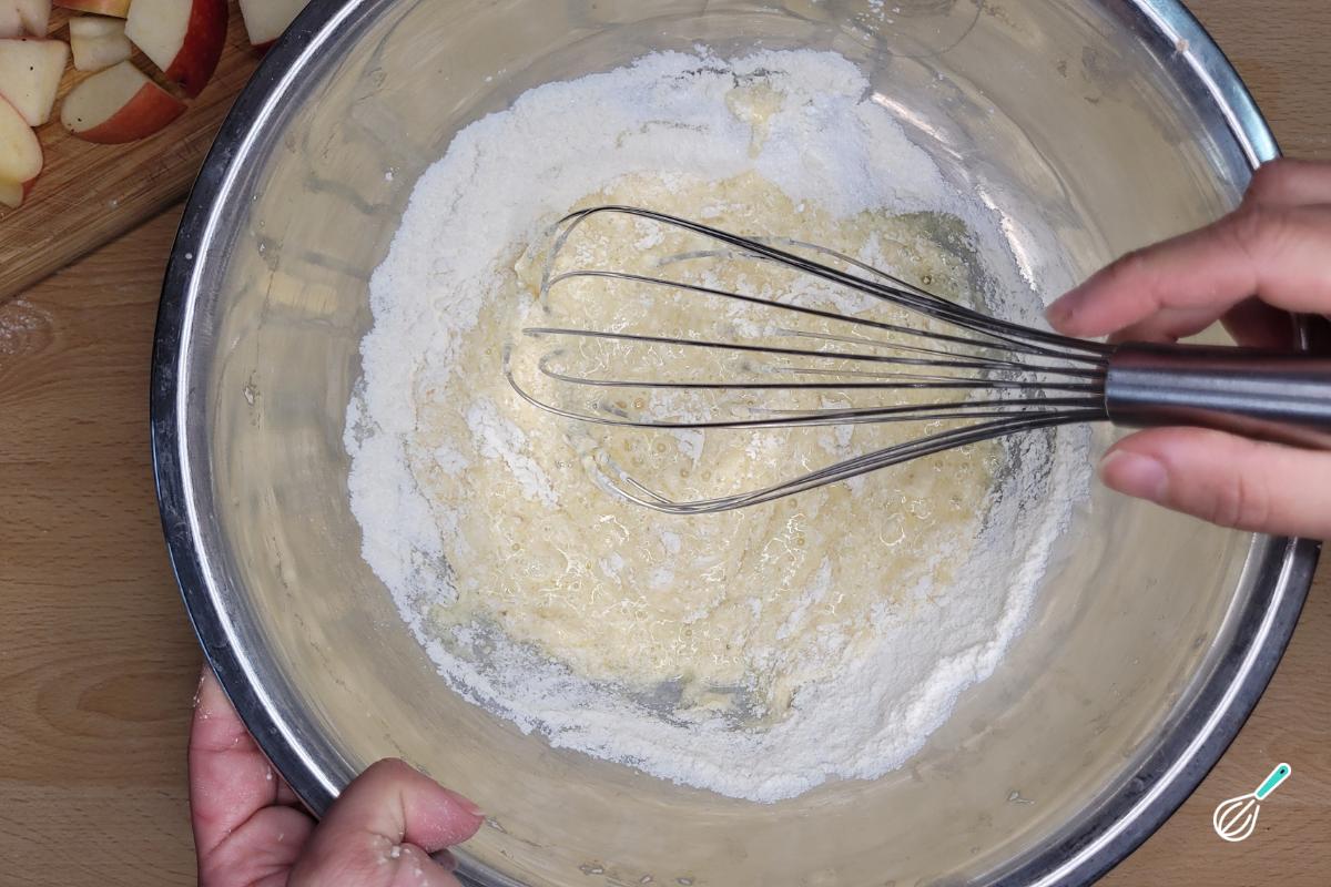 Em uma tigela grande, coloque os ingredientes secos e misture. Coloque a mistura de líquidos sobre os secos.