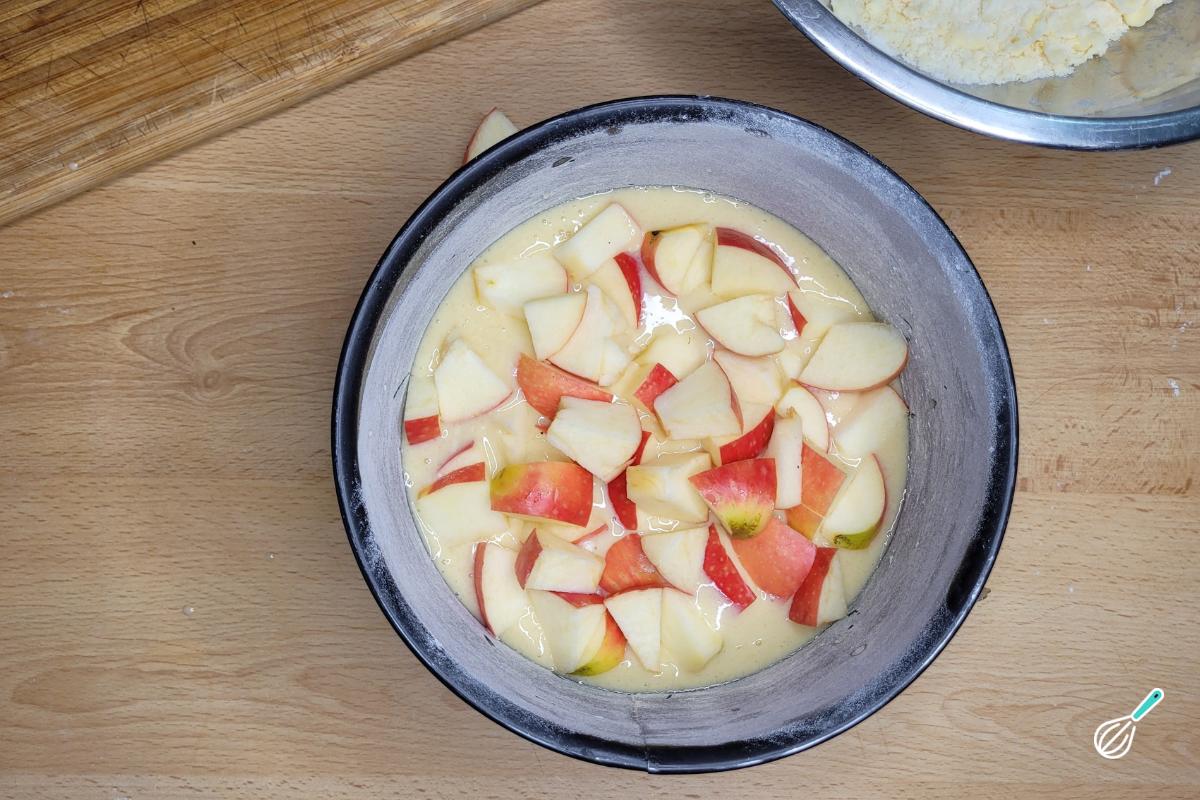 Despeje a massa em uma forma untada e enfarinhada, de preferência de fundo removível. Coloque as maçãs sobre a massa.