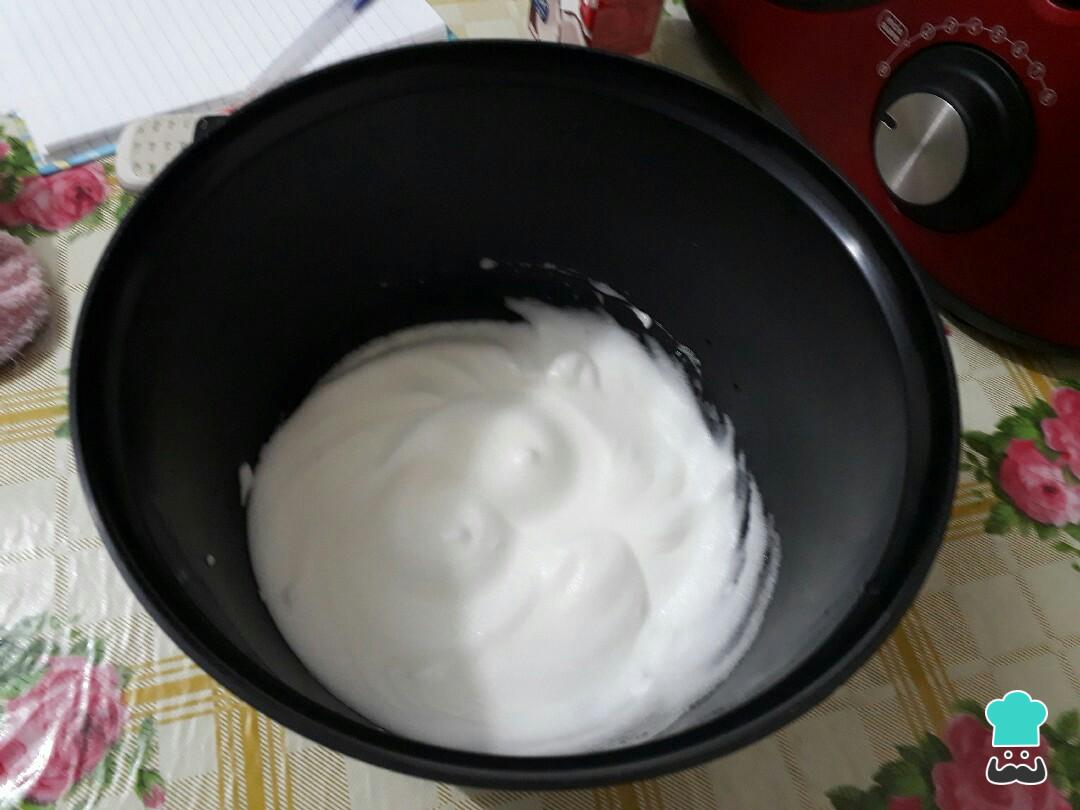 Comece preparando esta cuca de morango: separe as gemas das claras e bata as claras em neve, até ficarem bem consistentes, e reserve.