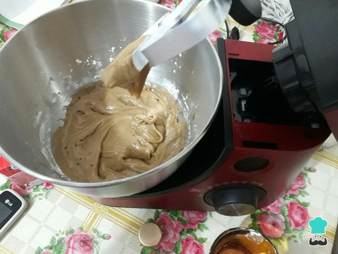 Aos poucos vá acrescentando a farinha e continue batendo. Junte também a goma xantana e bata mais um pouco até ficar uma massa lisa e homogênea.