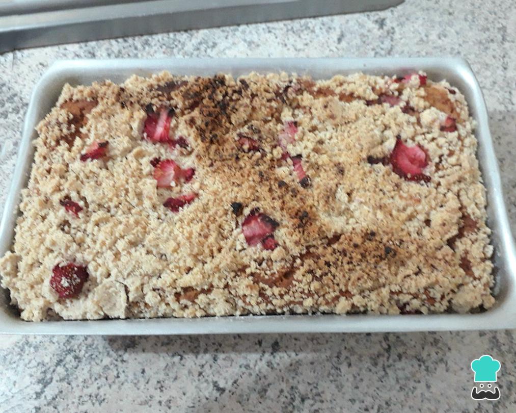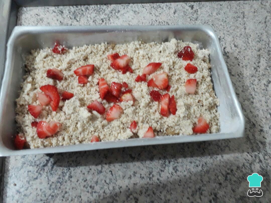 Prepare a farofa misturando os ingredientes respetivos e polvilhe sobre a cuca. Complete com mais alguns morangos e coloque no forno a 180 graus por 40 minutos.