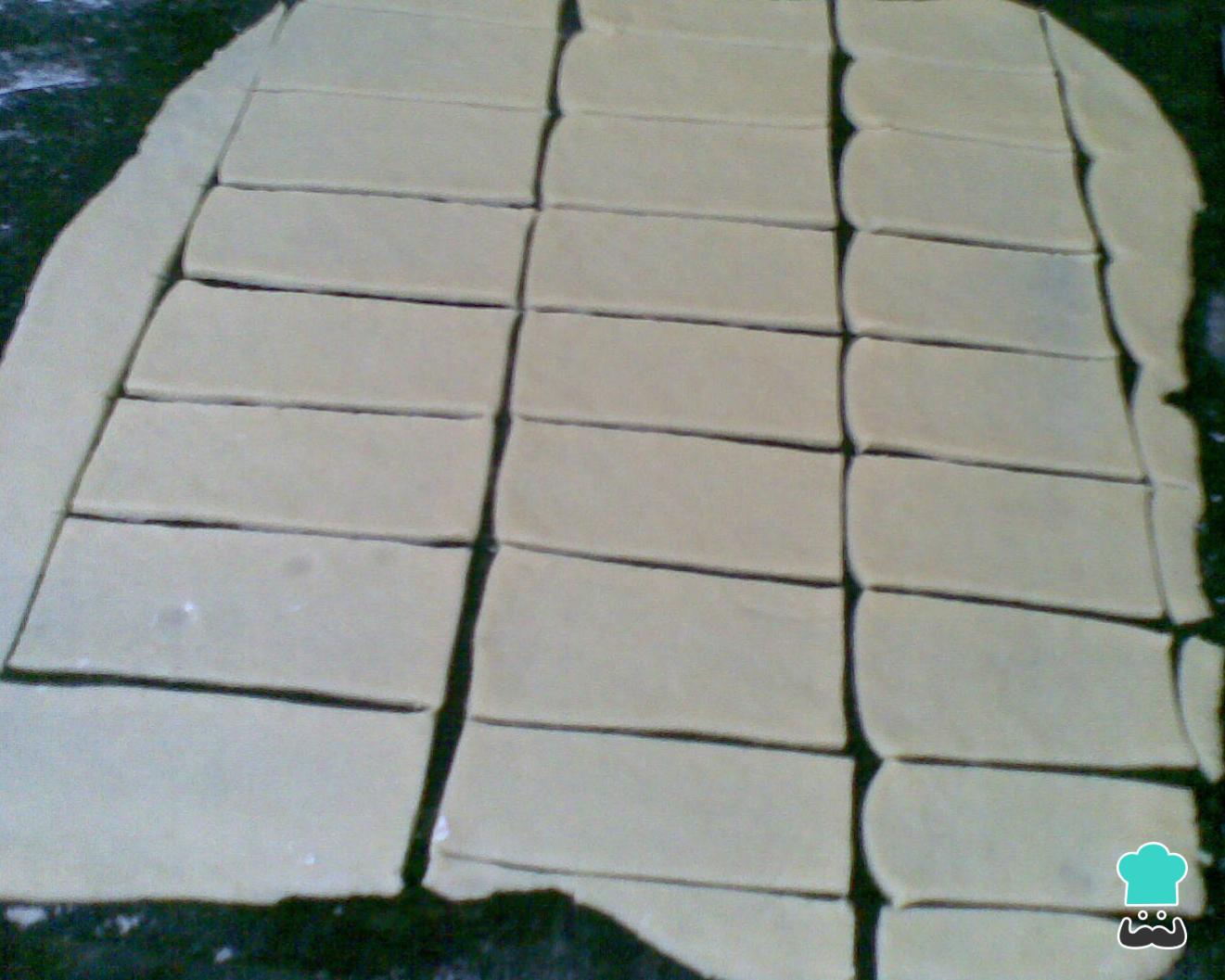 Depois do tempo indicado abra a massa de cueca virada com um rolo, até ficar com espessura de cerca de meio centímetro, e corte em vários retângulos.