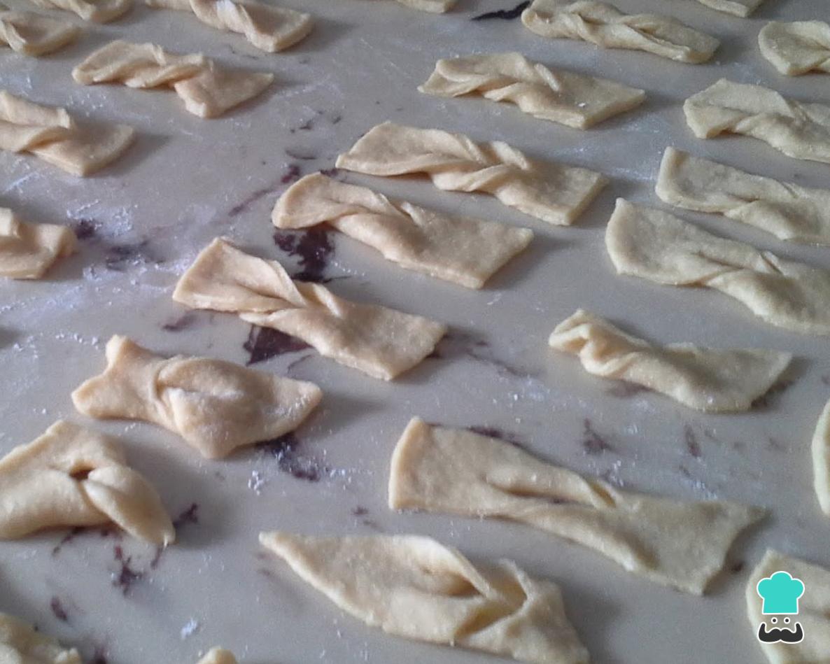 Chegou a hora de modelar a cueca virada: faça um corte longitudinal ao centro das tiras e passe uma das pontas da massa por dentro desse corte, uma ou duas vezes, para criar a o formato característico. Deixerepousar por mais 20 minutos.