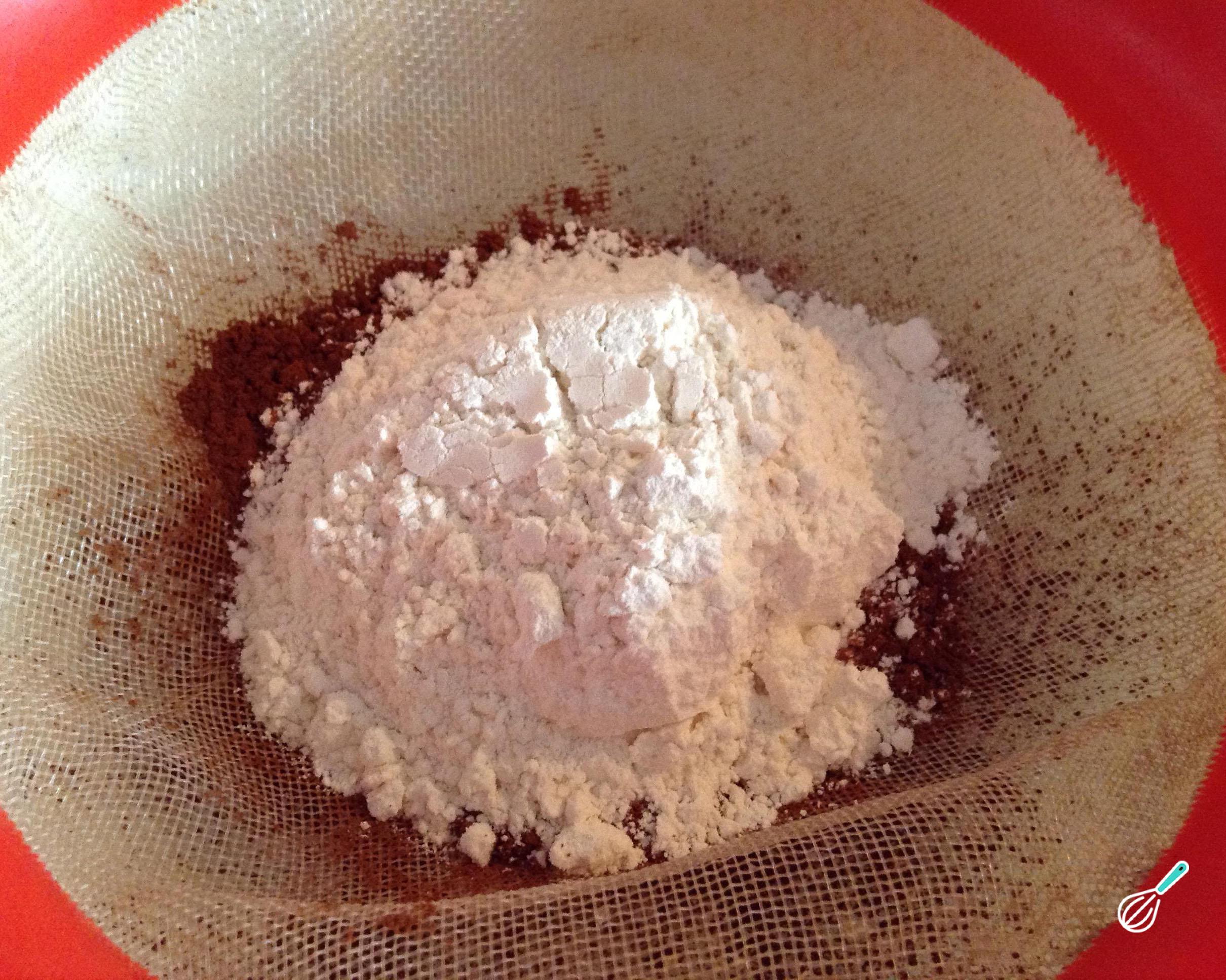 Coloque a farinha de trigo, o chocolate ou cacau em pó e o sal num bowl. Peneire estes ingredientes, para conseguir uma massa de cupcakes mais fofa.