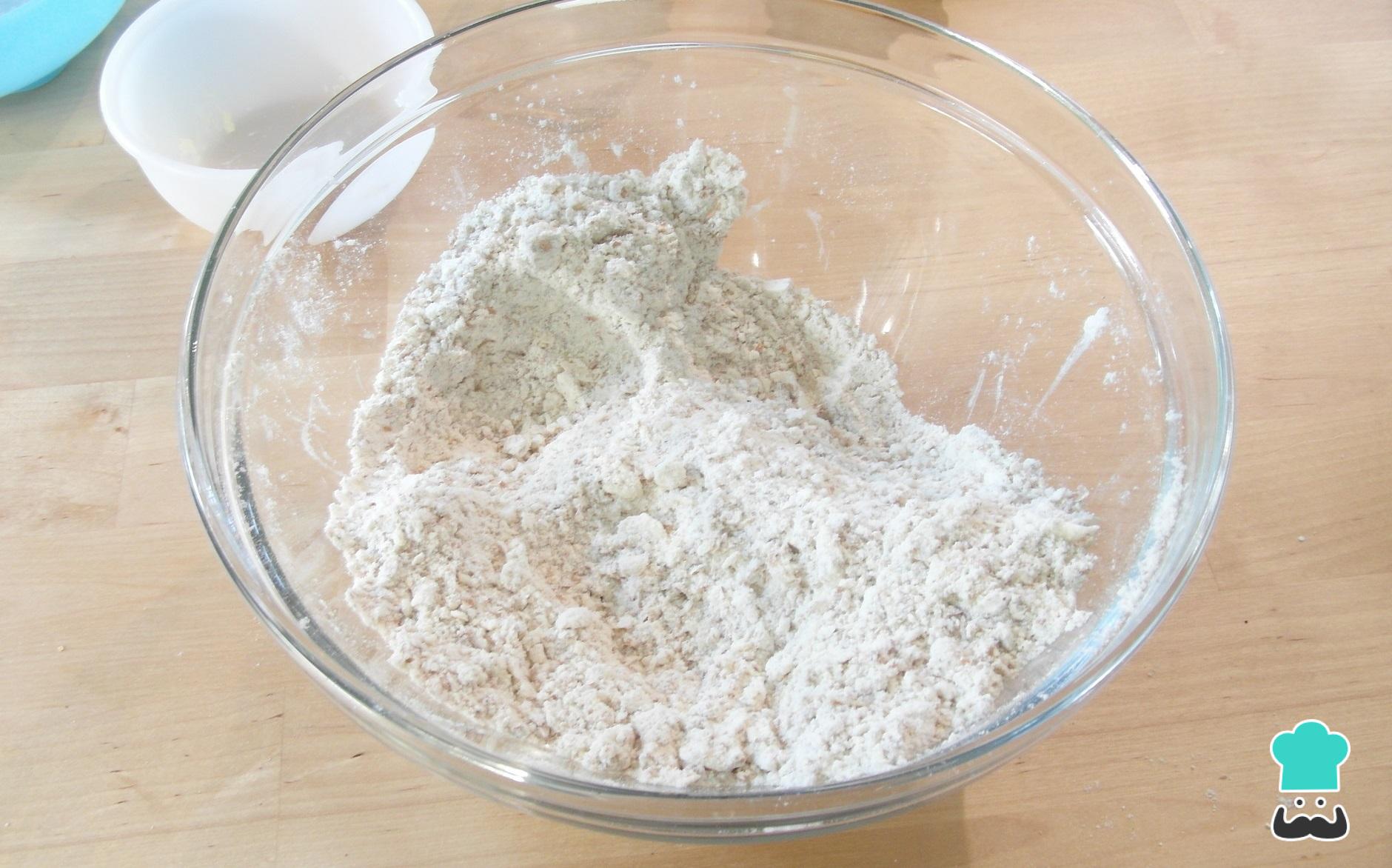 O primeiro passo dessa receita de cupcake de maçã é misturar os ingredientes sólidos (a farinha, a aveia, o açúcar, a canela e o fermento).