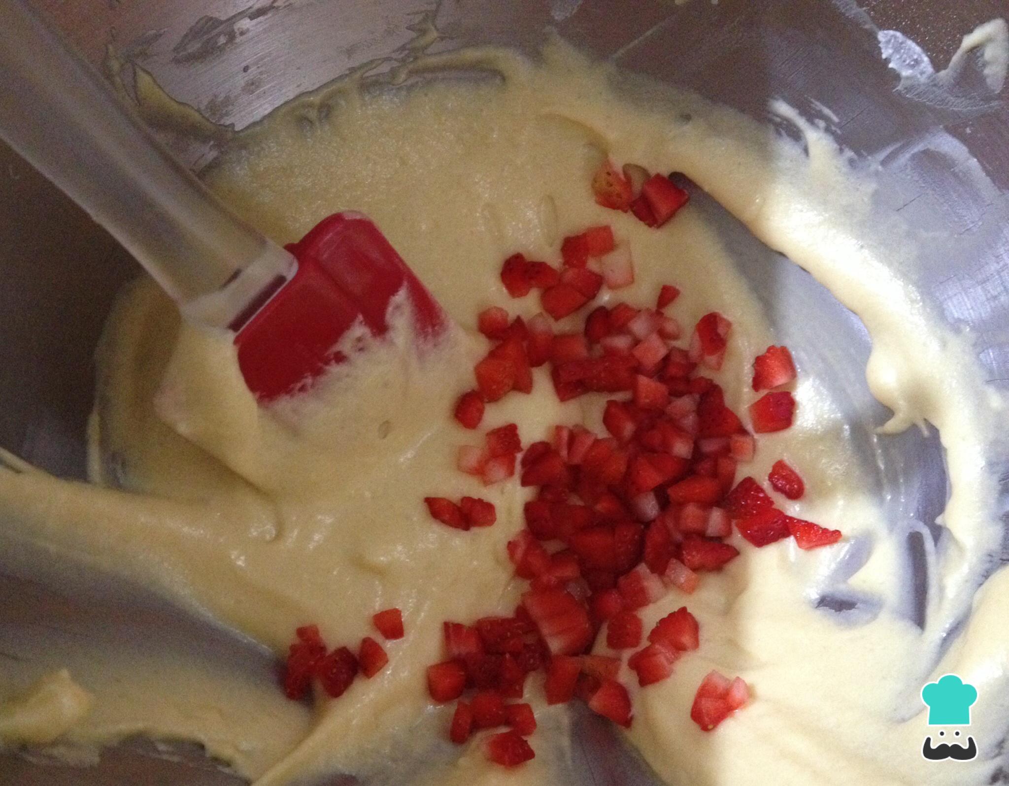 Corte os morangos em cubos muito pequenos e acrescente à mistura.