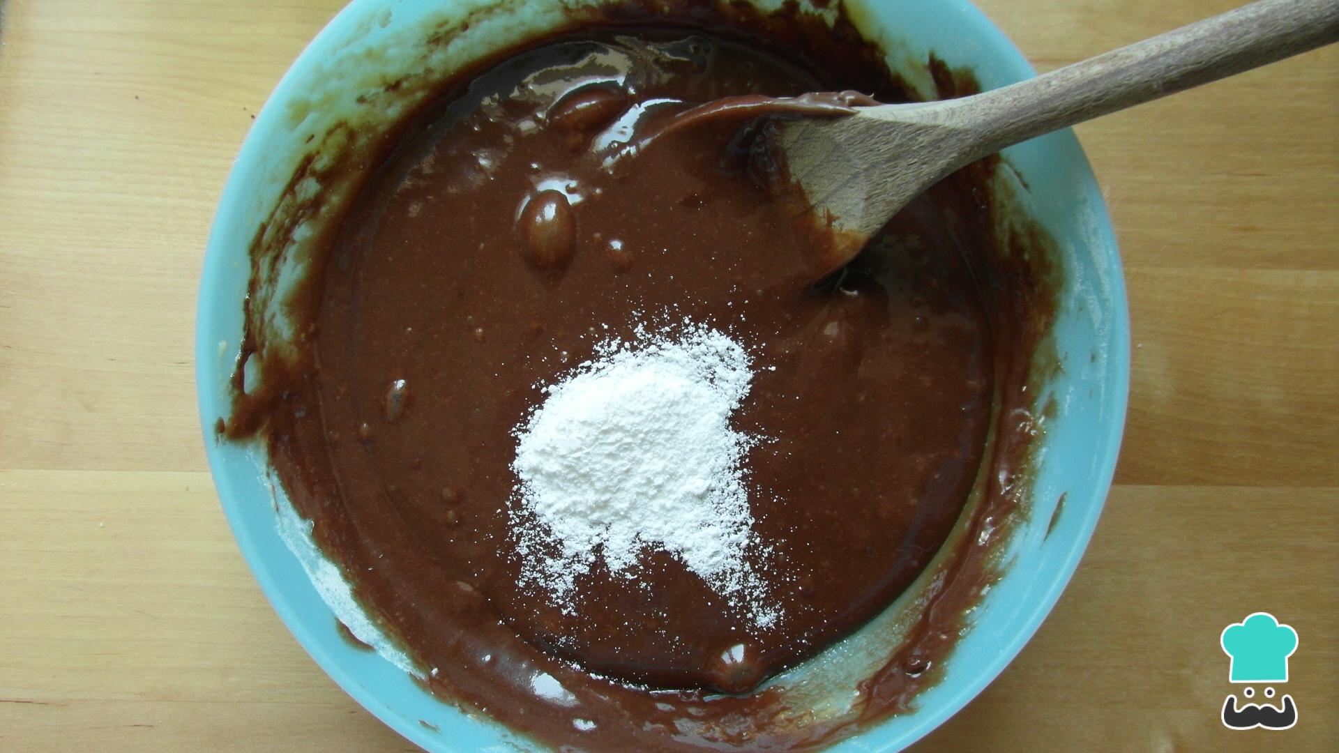 Acrescente a Nutella (para ser mais fácil misturar pode derreter ligeiramente no microondas) e mexa muito bem para que a massa dos cupcakes de Nutella fique com uma cor uniforme. Por fim adicione o fermento e volte a mexer.