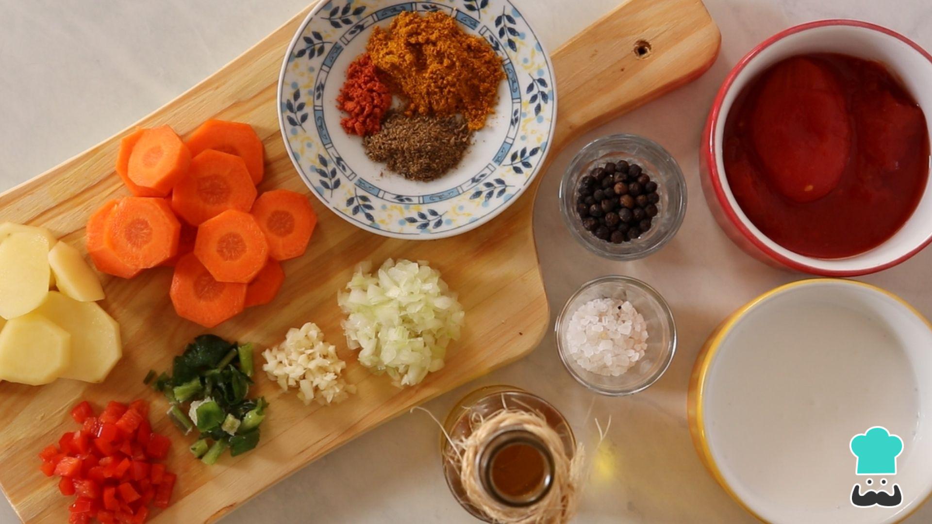 Comece separando os ingredientes deste curry vegano e fazendo o pré-preparo: descasque e corte a cenoura e as batatas em rodelas, pique a cebola, o alho e o coentro e corte o pimentão em cubinhos pequenos. Para fazer essa receita grão de bico já deve estar cozido e escorrido.