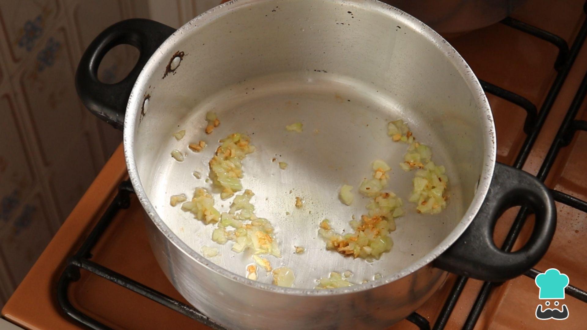 Noutra panela refogue o alho e a cebola no azeite até dourarem bem.