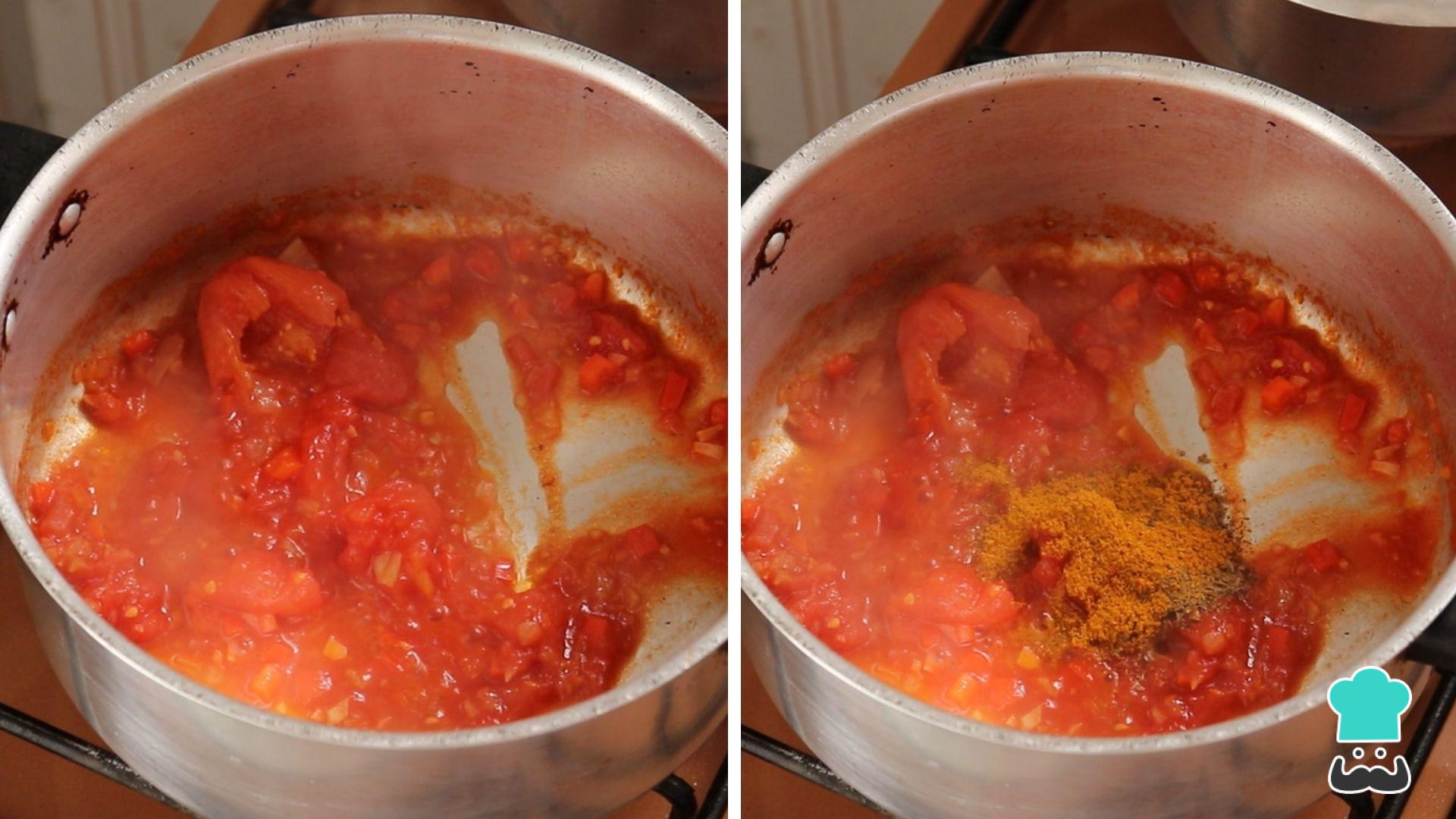 Despeje o tomate pelado, mexa bem e em seguida acrescente os temperos: curry, cominho e páprica. Misture bem mais uma vez.