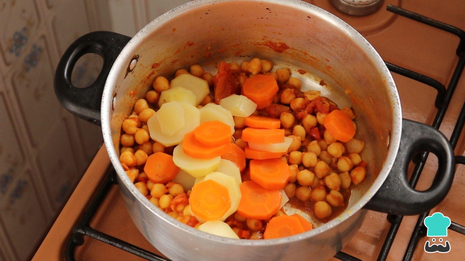 Junte as batatas, as rodelas de cenoura e o grão de bico (todos já cozidos). Misture bem para pegar o sabor e tempere com sal a gosto.