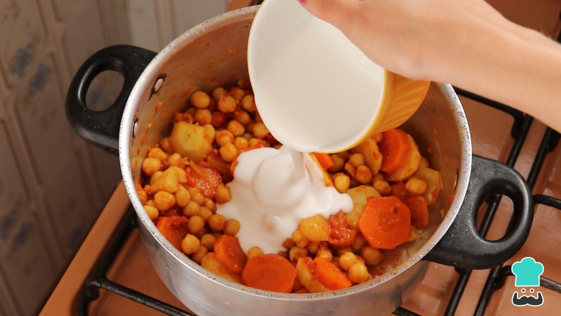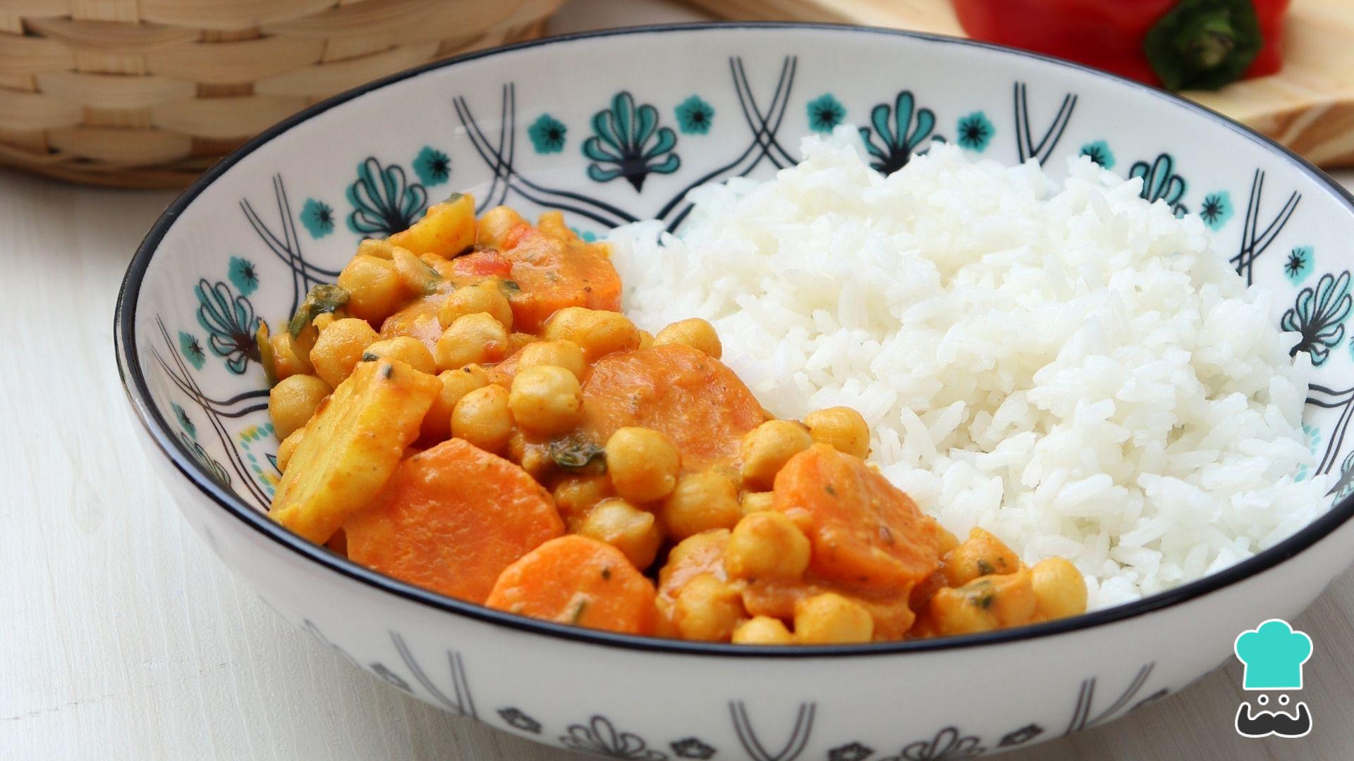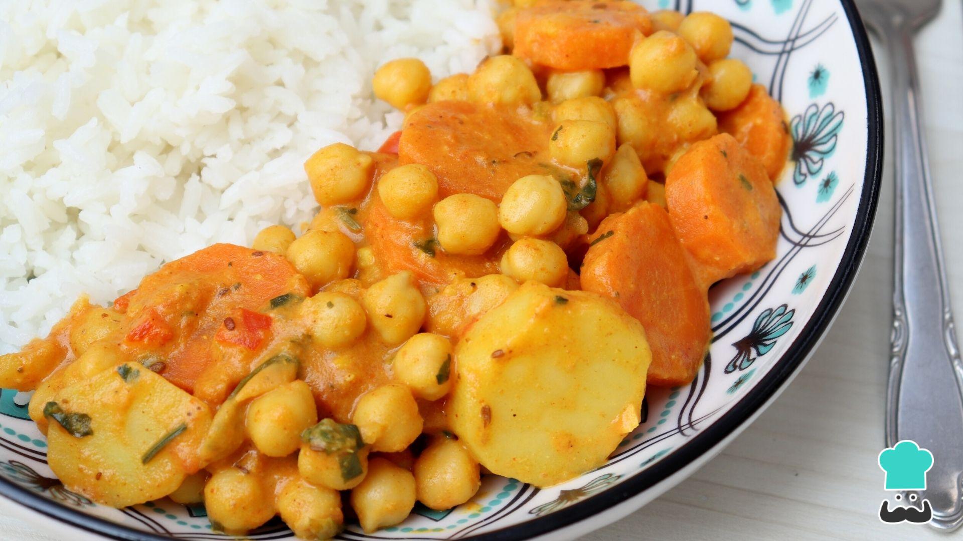 Com cenoura e batata, esse curry de grão de bico leva, claro, além do próprio curry, cominho e páprica entre os temperos, garantindo muito sabor para esse prato. Já o molho é composto por tomate pelado e leite de coco, prático e super saboroso.