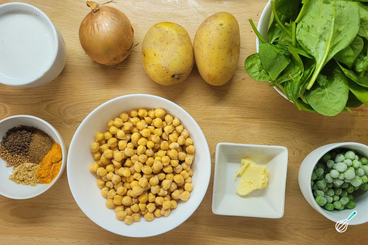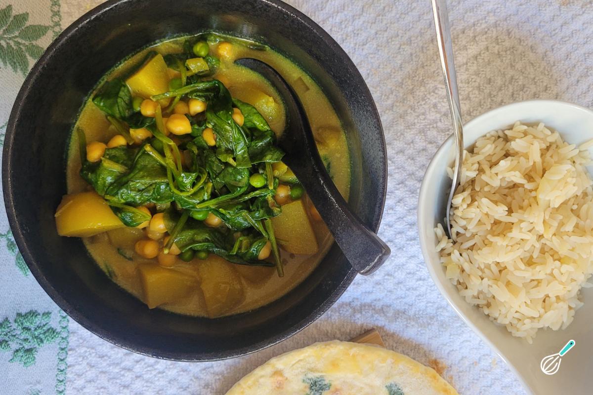 Aqui, fiz um curry de batata, grão de bico, espinafre e ervilhas congeladas, com um molho à base de leite de coco, uma combinação de ingredientes muito usada na culinária indiana. Com essa receita, você vai trazer os sabores da Índia para a sua casa.