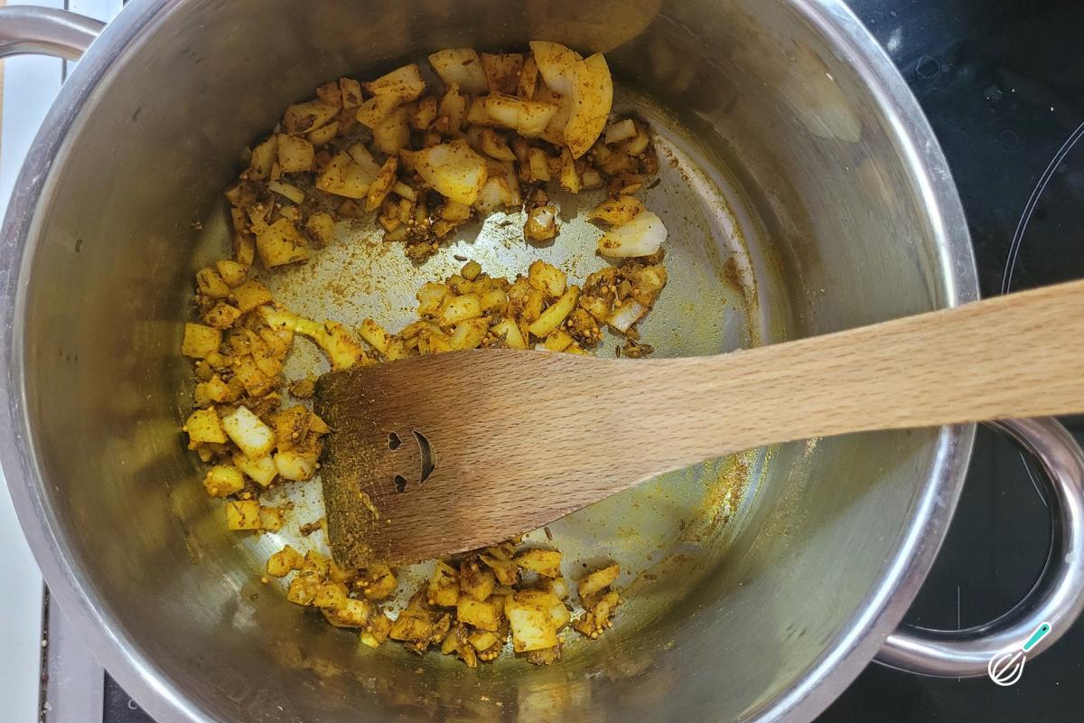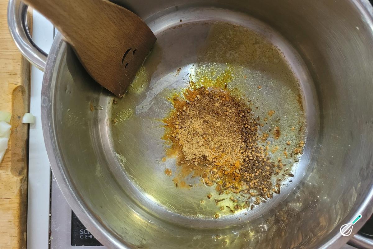 Quando esquentar, adicione as especiarias e deixe refogar por cerca de 1-2 minutos, até que soltem o aroma. Adicionar as especiarias antes de refogar a cebola faz com que elas soltem ainda mais o sabor.
