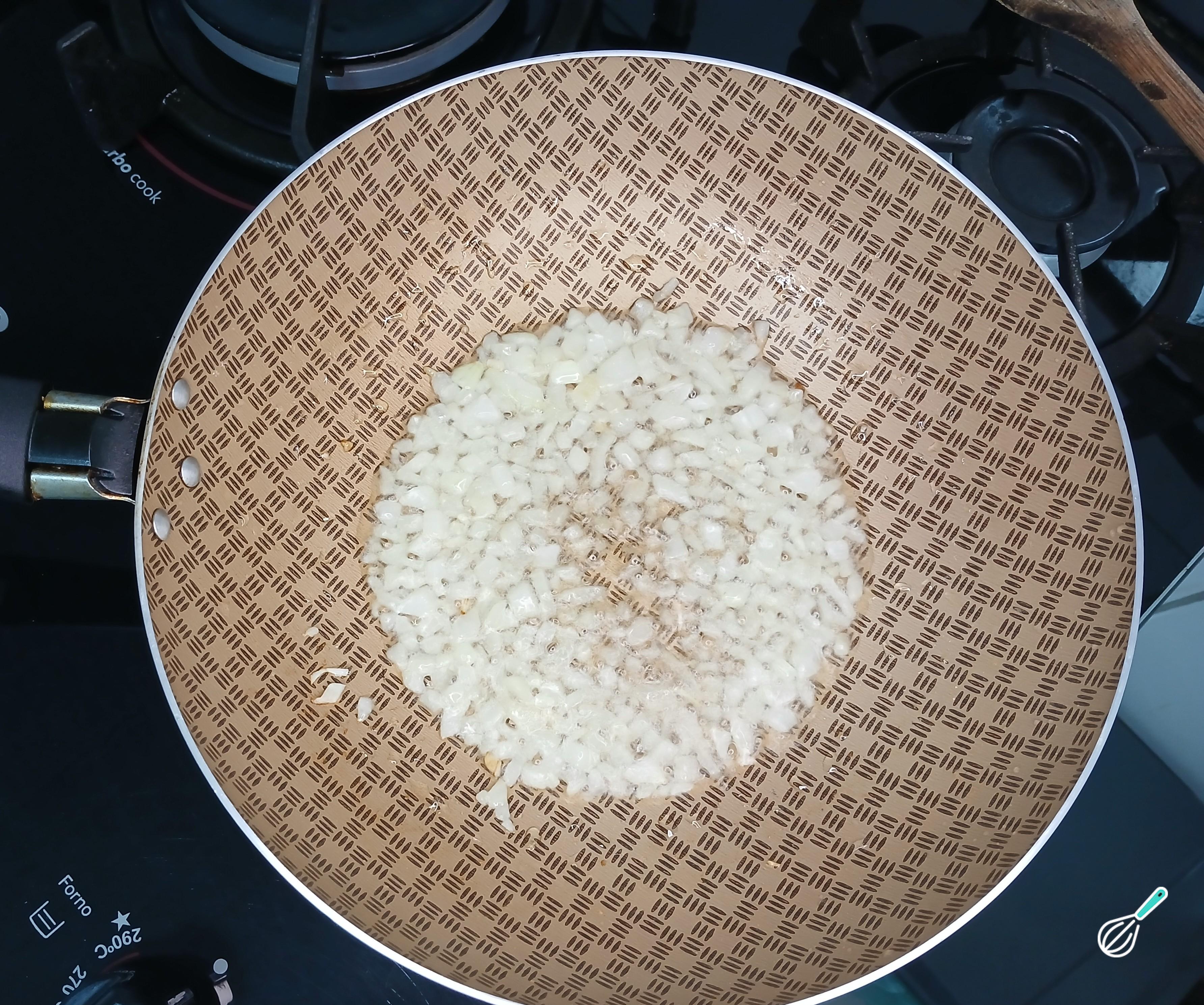 Coloque a frigideira no fogo. Adicione o óleo e a cebola branca para refogar. Não deixe dourar, somente refogar para que murche.
