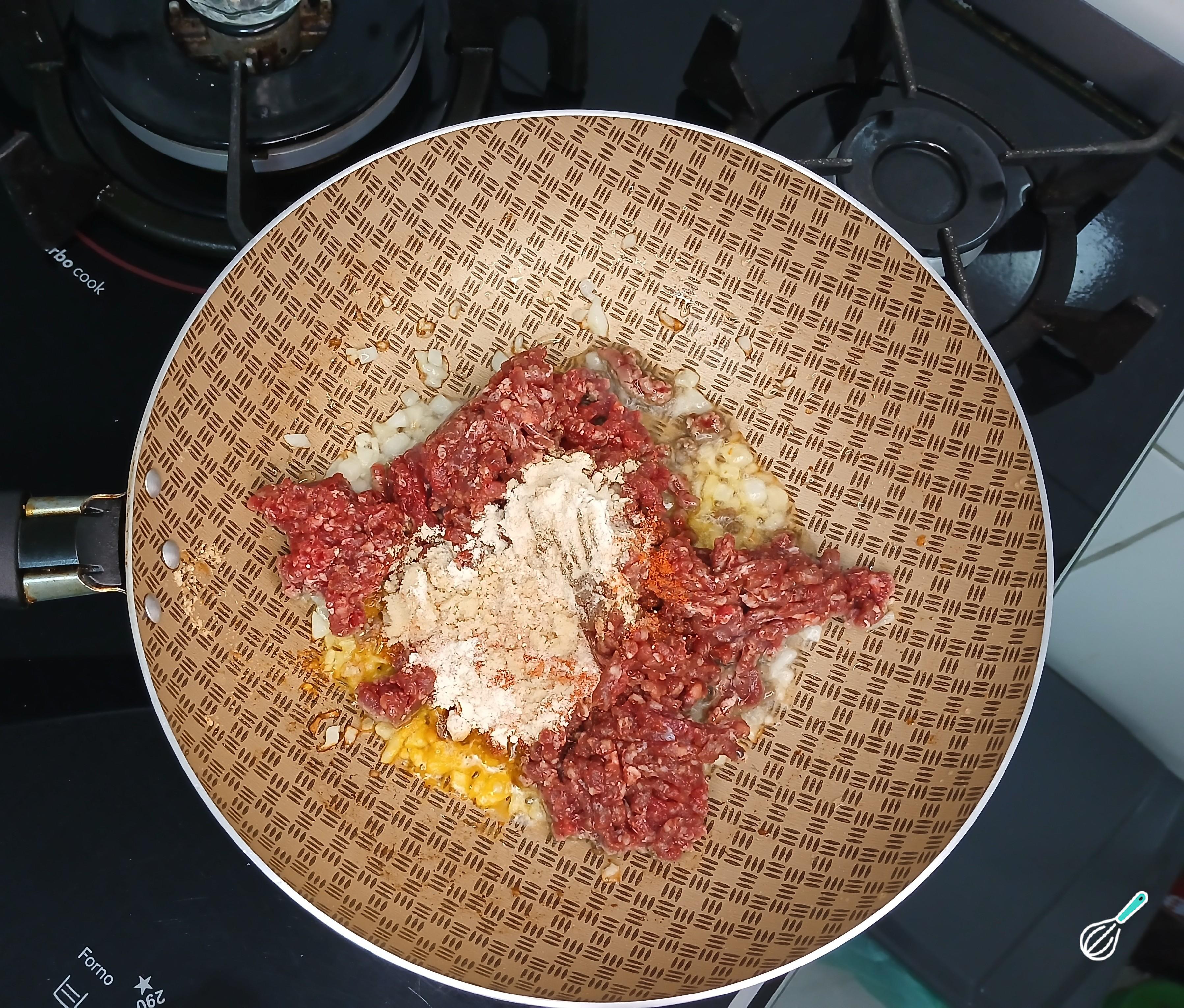 Depois de refogar a cebola, adicione a carne moída, sal, pimenta caiena, alho e cebola em pó e páprica defumada. Refogue bem a carne moída e mexa bem para incorporar os sabores dos temperos.
