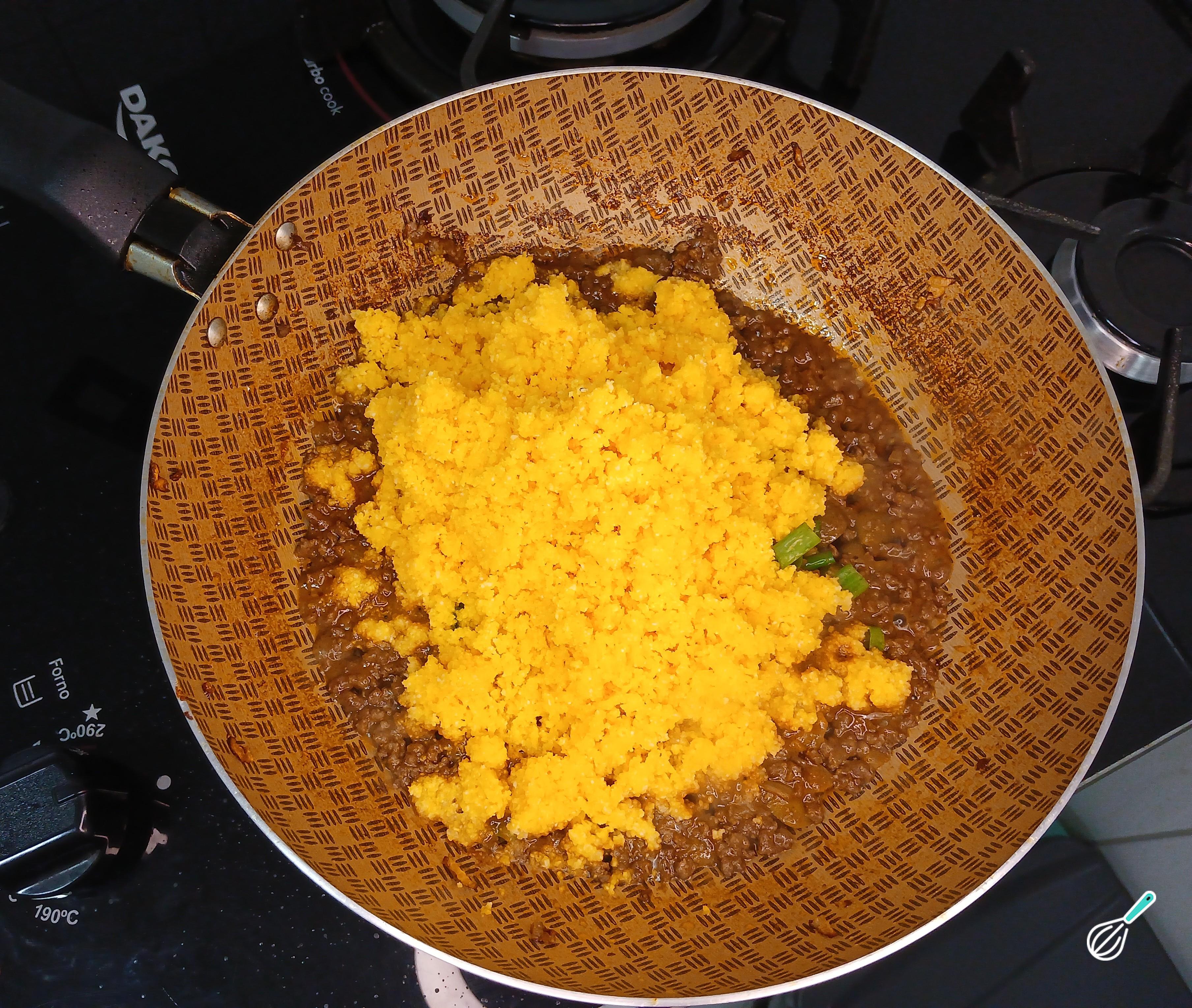 Com a água da carne moída quase secando, adicione a farinha de cuscuz já hidratada e mexa bem. Misture tudo para incorporar bem os sabores.