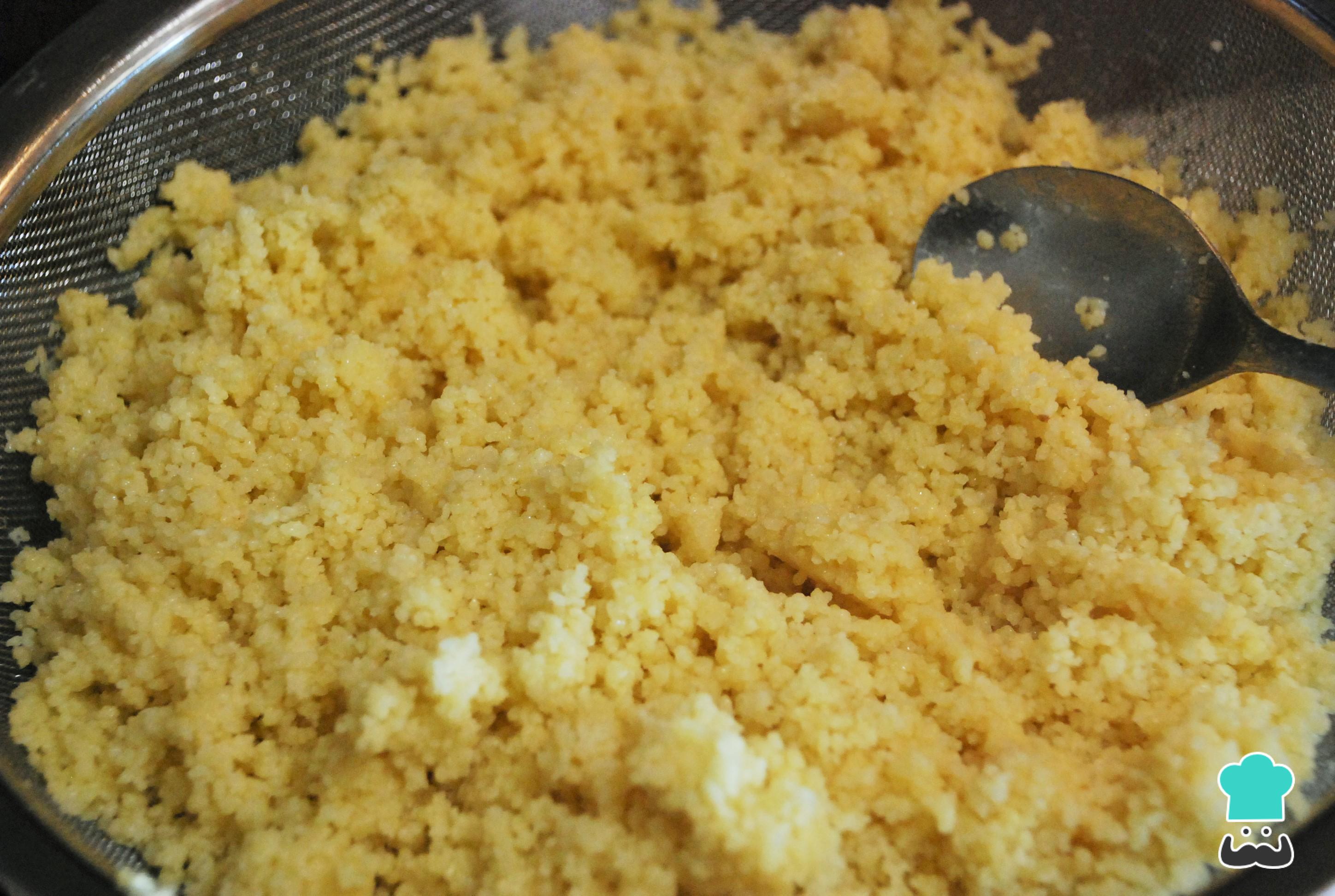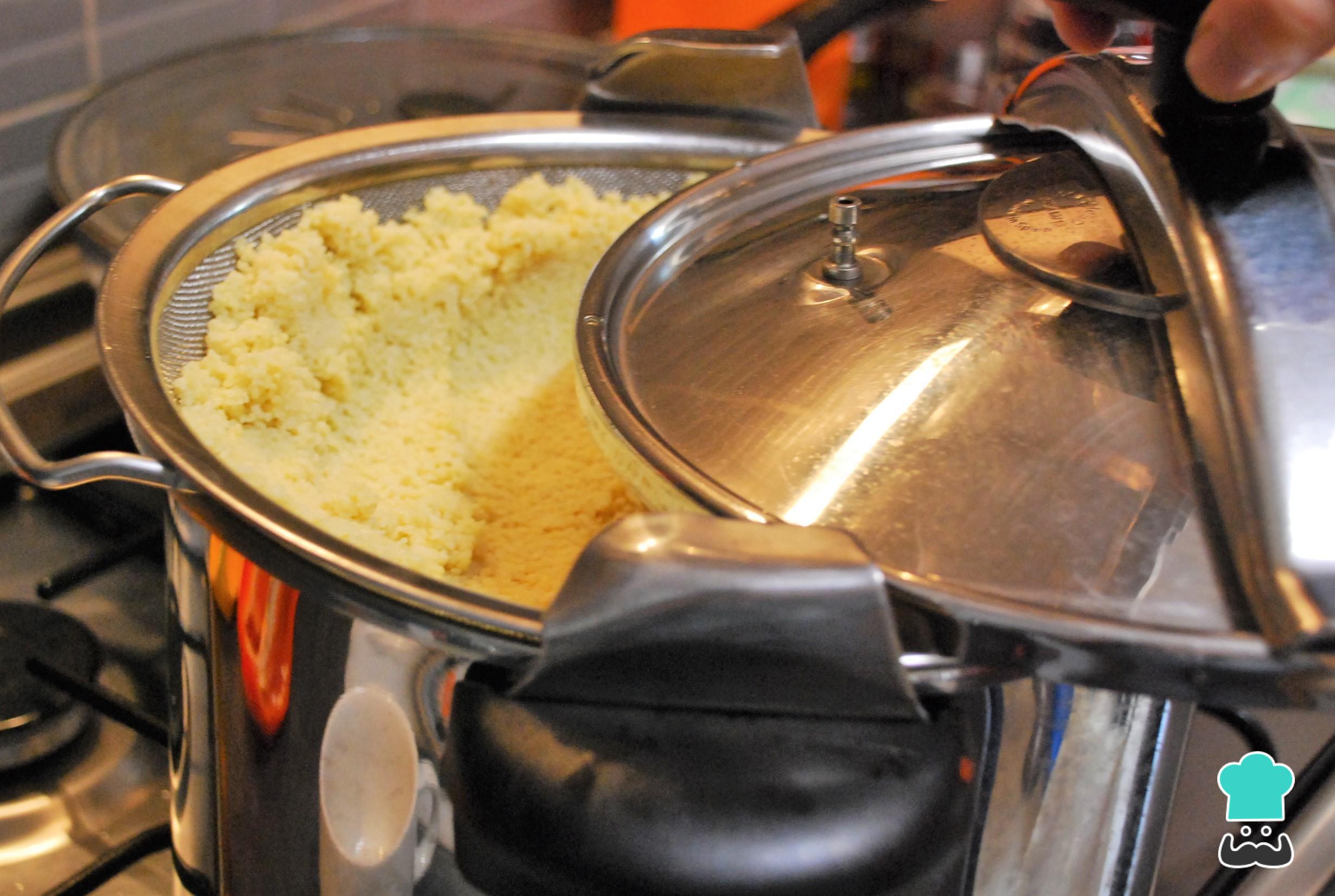 Seguidamente termine de cozinhar o cuscuz numa cuscuzeira ou vaporeira por 5 minutos.