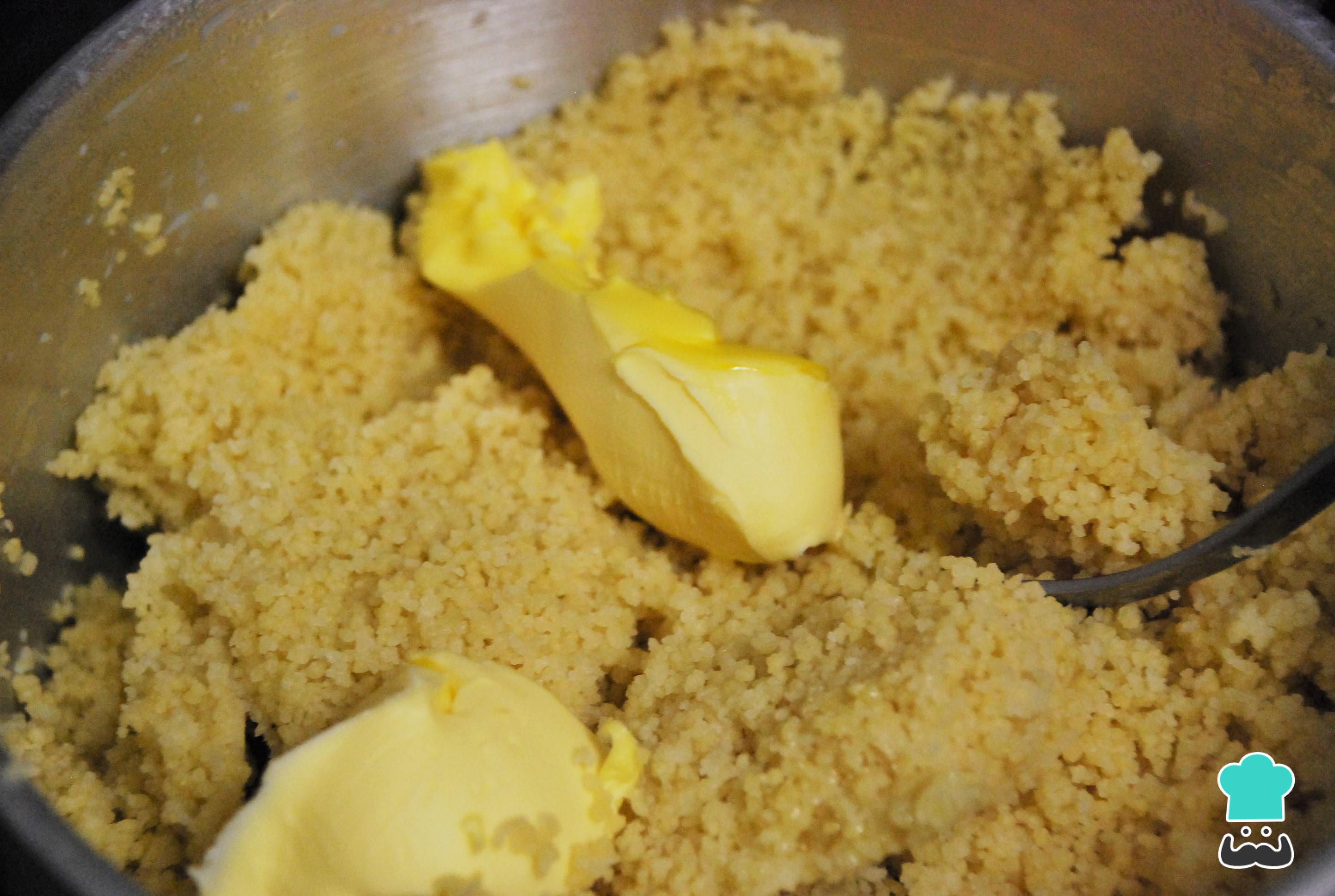 Após 5 minutos, retire o cuscuz para uma tigela e mexa com um garfo, para separar os grãos. Adicione manteiga e misture bem.